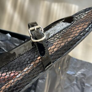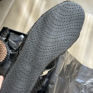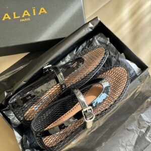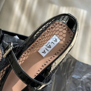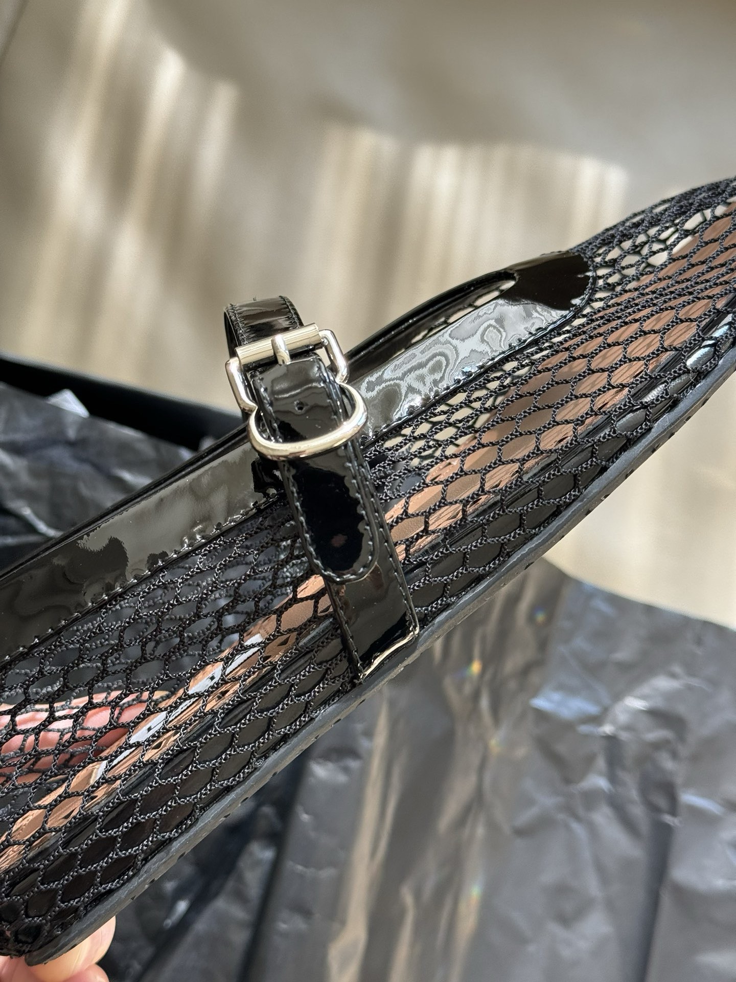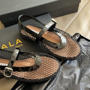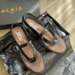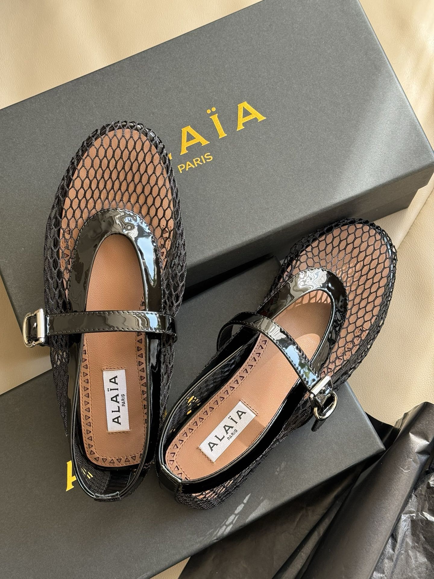 Alaïa gives the humble ballet flats a modern update. This pair has been crafted from mesh reinforced with glossy patent-leather straps. They have classic round toes.