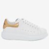 Strong fashion currency among the street style set, the signature platform sneaker from Alexander McQueen is updated with a gold leather heel. Crafted from white leather, it sits on a chunky rubber outsole – its defining feature. Easily pair yours with dresses and pants alike all season long.