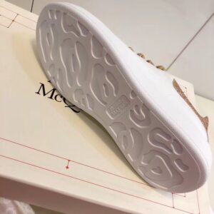 Strong fashion currency among the street style set, the signature platform sneakers from Alexander McQueen are updated with glitter-coated heel counters. Crafted from white leather, they sit on chunky rubber outsoles with built-in wedges for height and comfort – a defining feature of the cult silhouette.