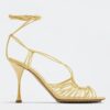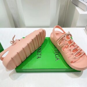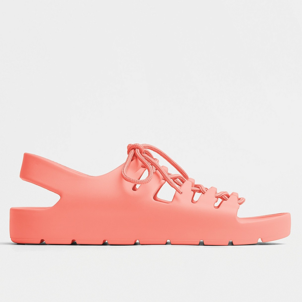 Although a clear departure from the label’s signature formula and aesthetic, the Jelly sandals are still undoubtedly a creation of Bottega Veneta. Crafted from durable rubber in a seamless construction, the pair sits atop a flatform sole and is detailed with laces to the upper that intertwine between the cut-out panels – a nod to the label’s iconic Intrecciato weave.