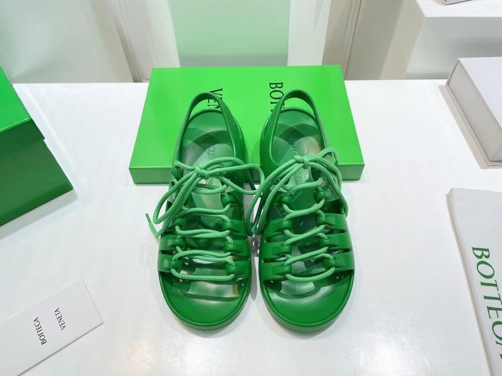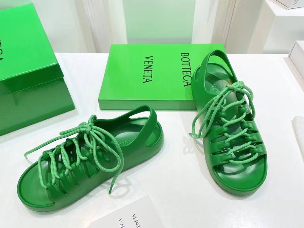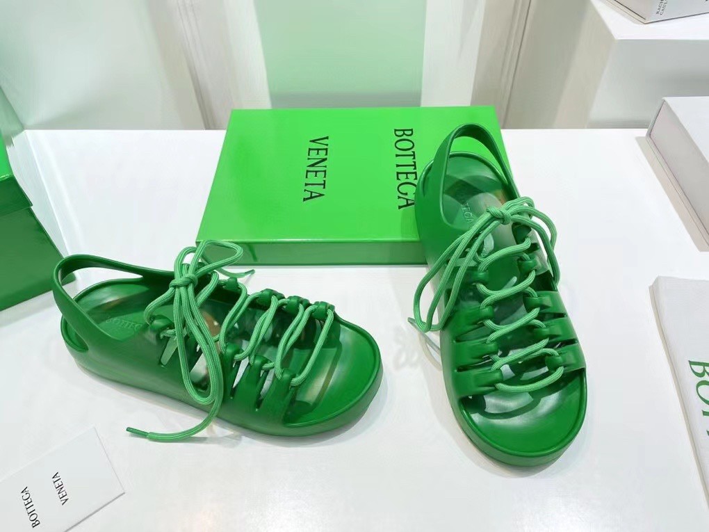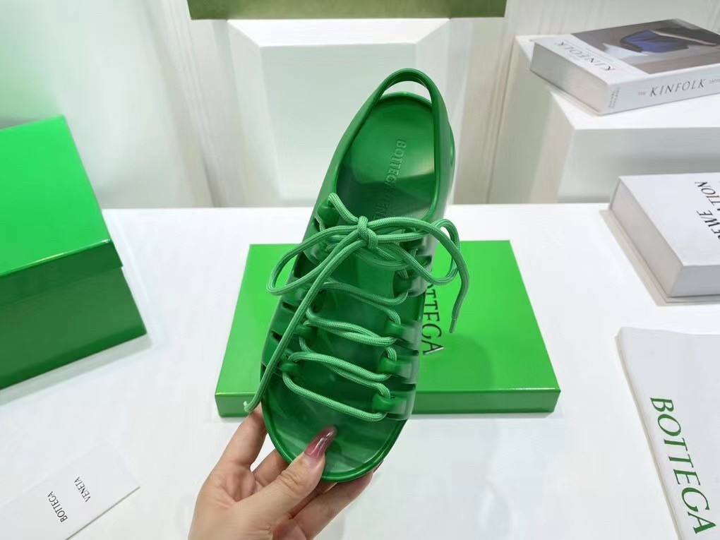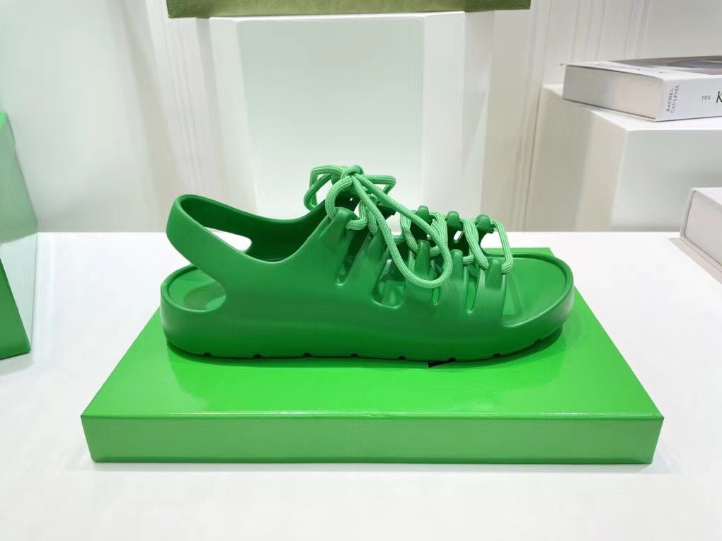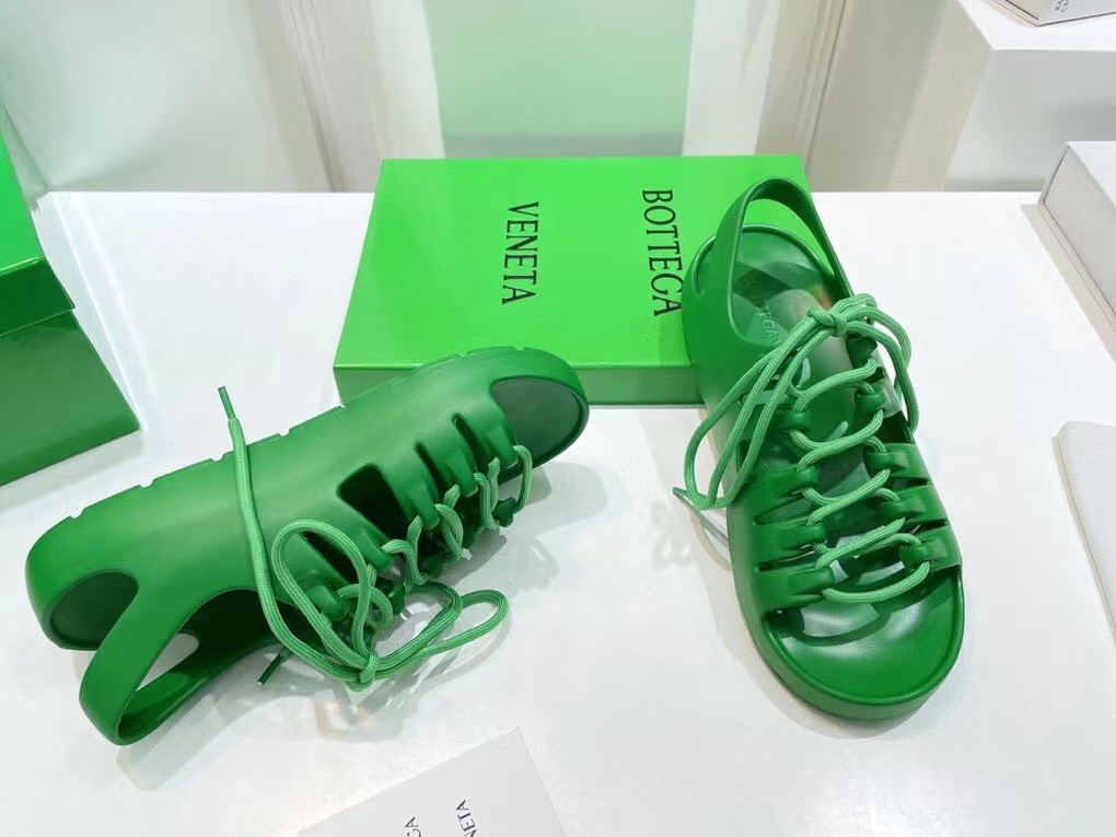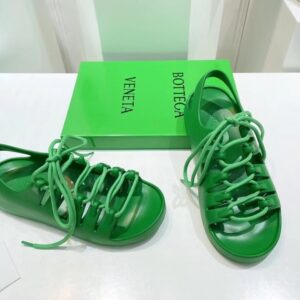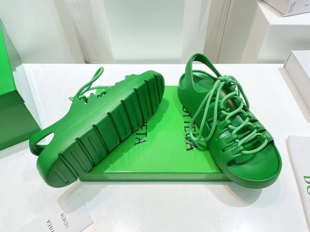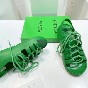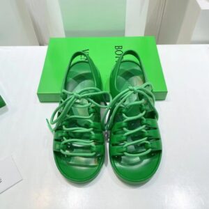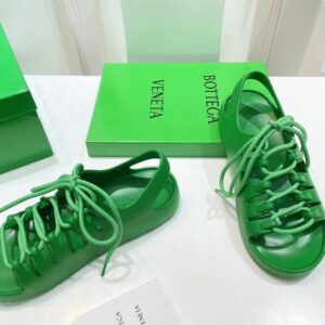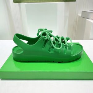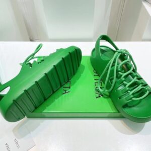 Although a clear departure from the label’s signature formula and aesthetic, the Jelly sandals are still undoubtedly a creation of Bottega Veneta. Crafted from durable rubber in a seamless construction, the pair sits atop a flatform sole and is detailed with laces to the upper that intertwine between the cut-out panels – a nod to the label’s iconic Intrecciato weave.
