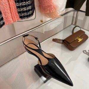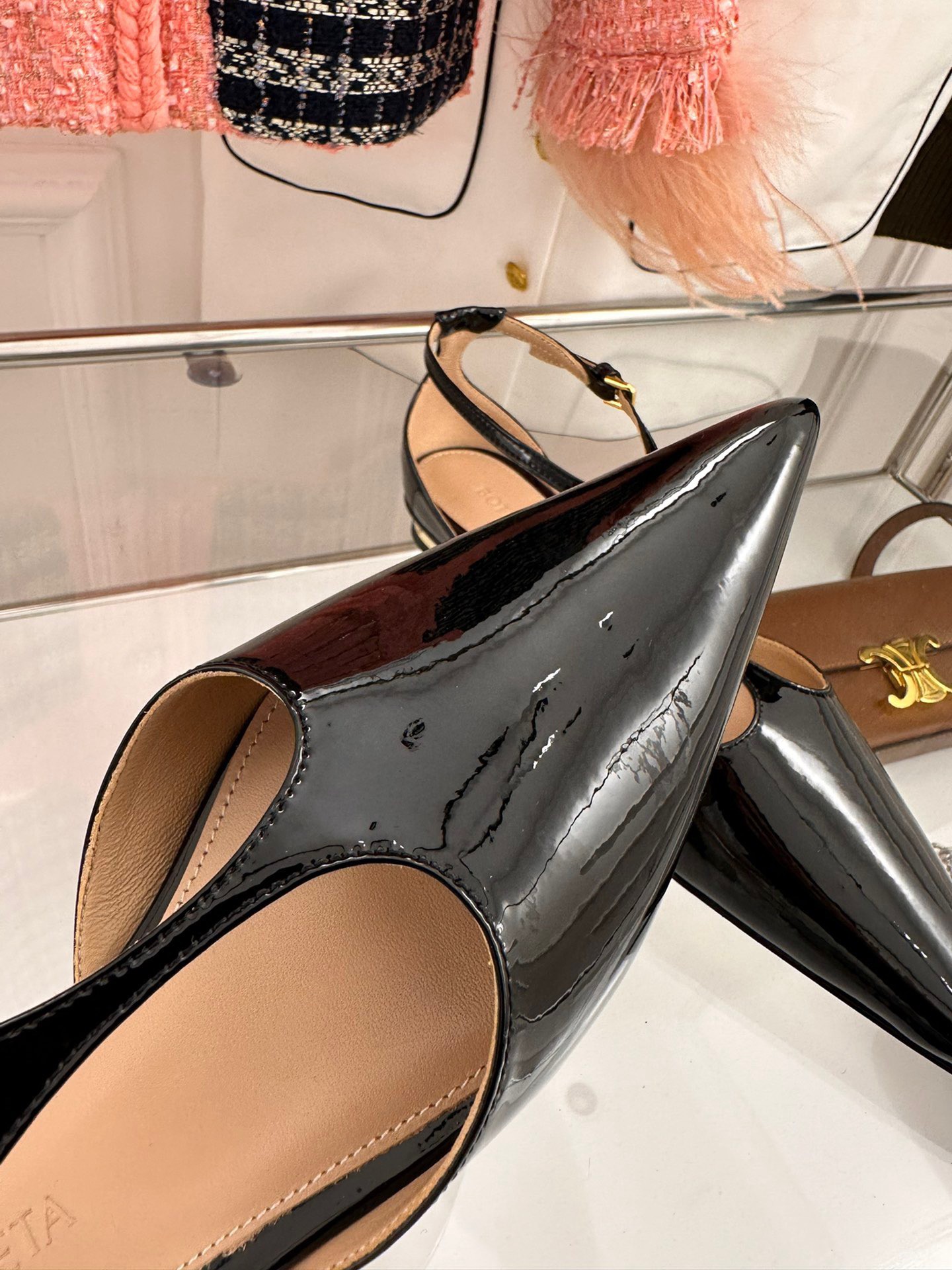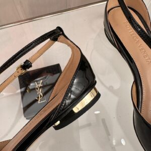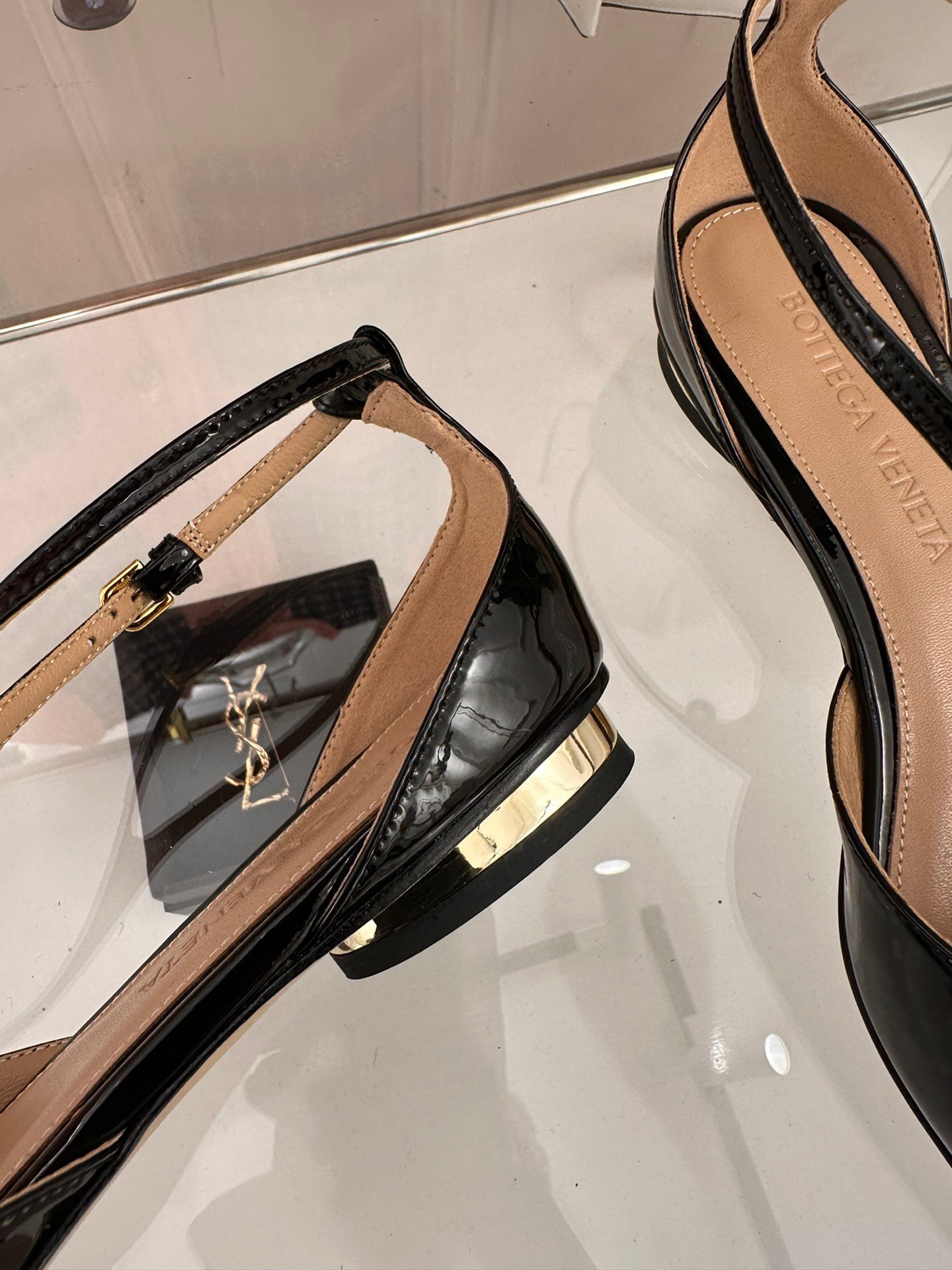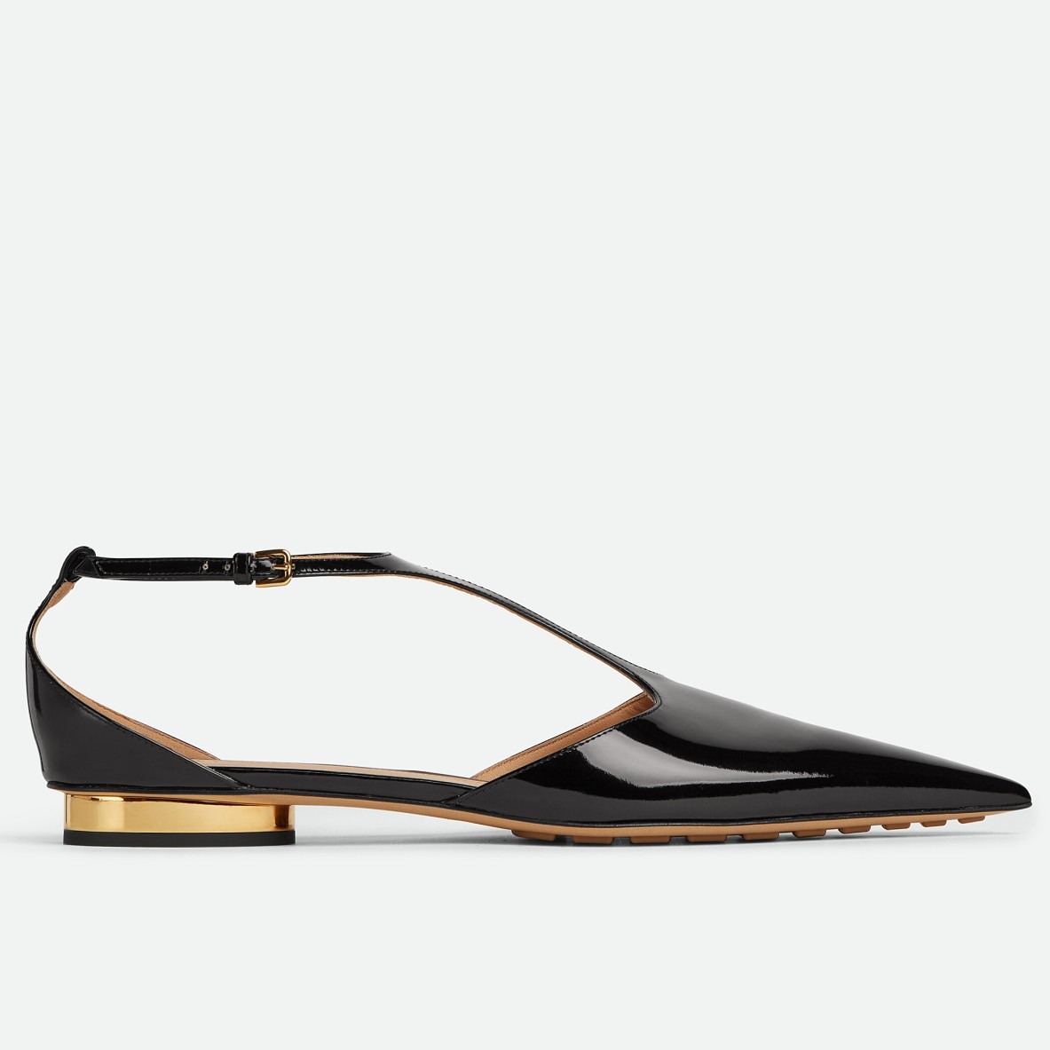 A signature shape for Bottega Veneta, these t-bar flats are laminated for additional shine. In glossy patent calfskin, they have a sleek, elongated feel and are kept in place by the strap at the back.