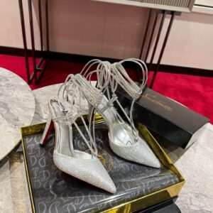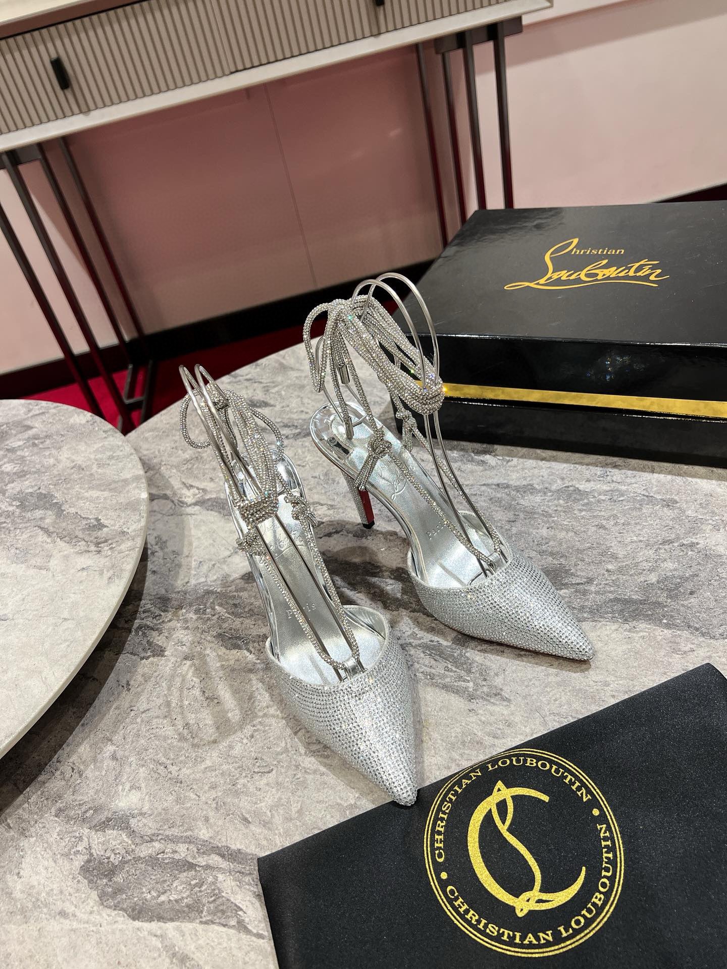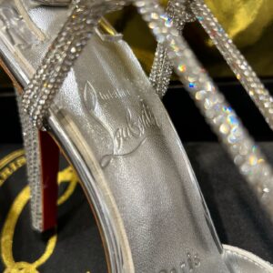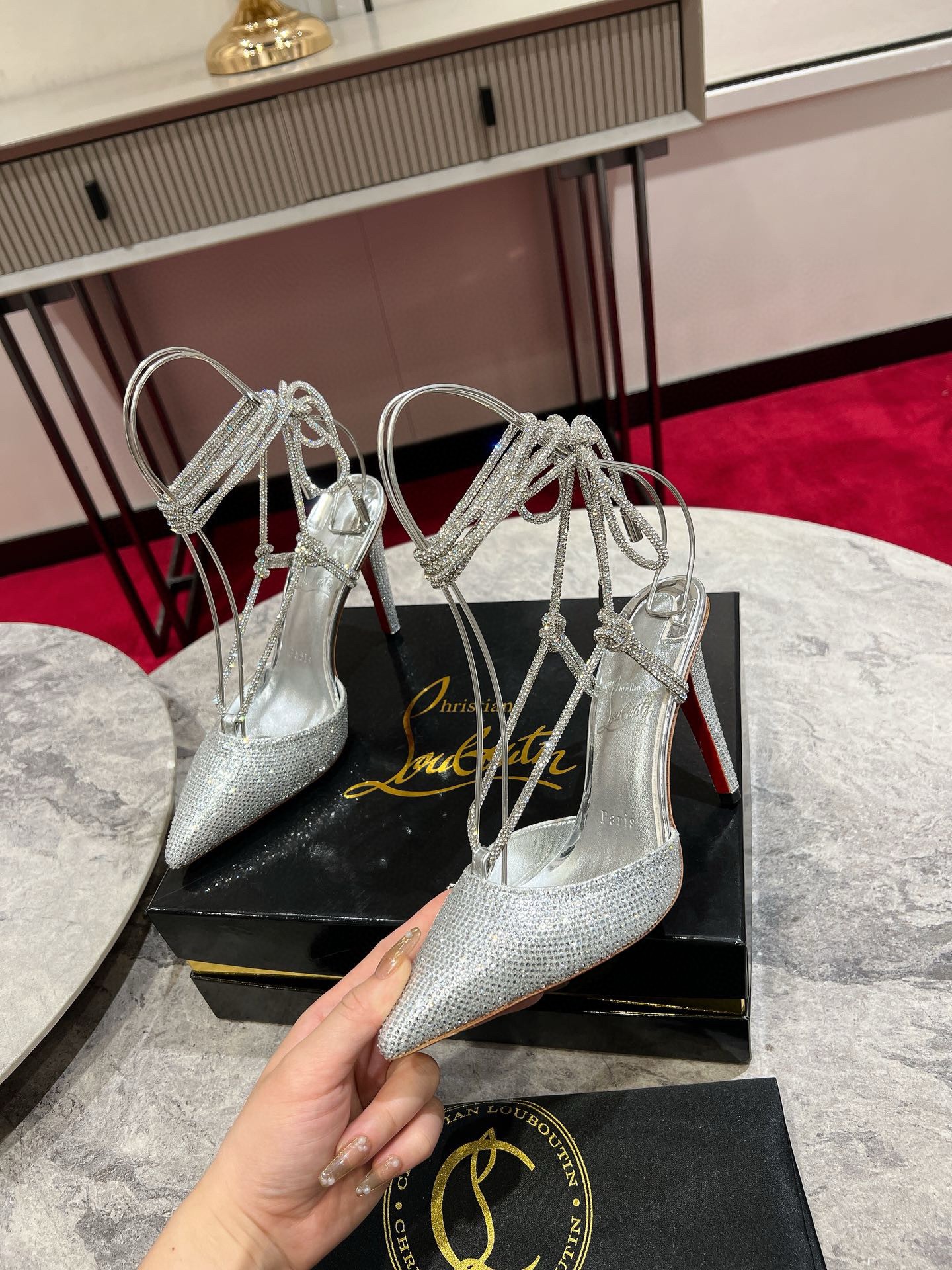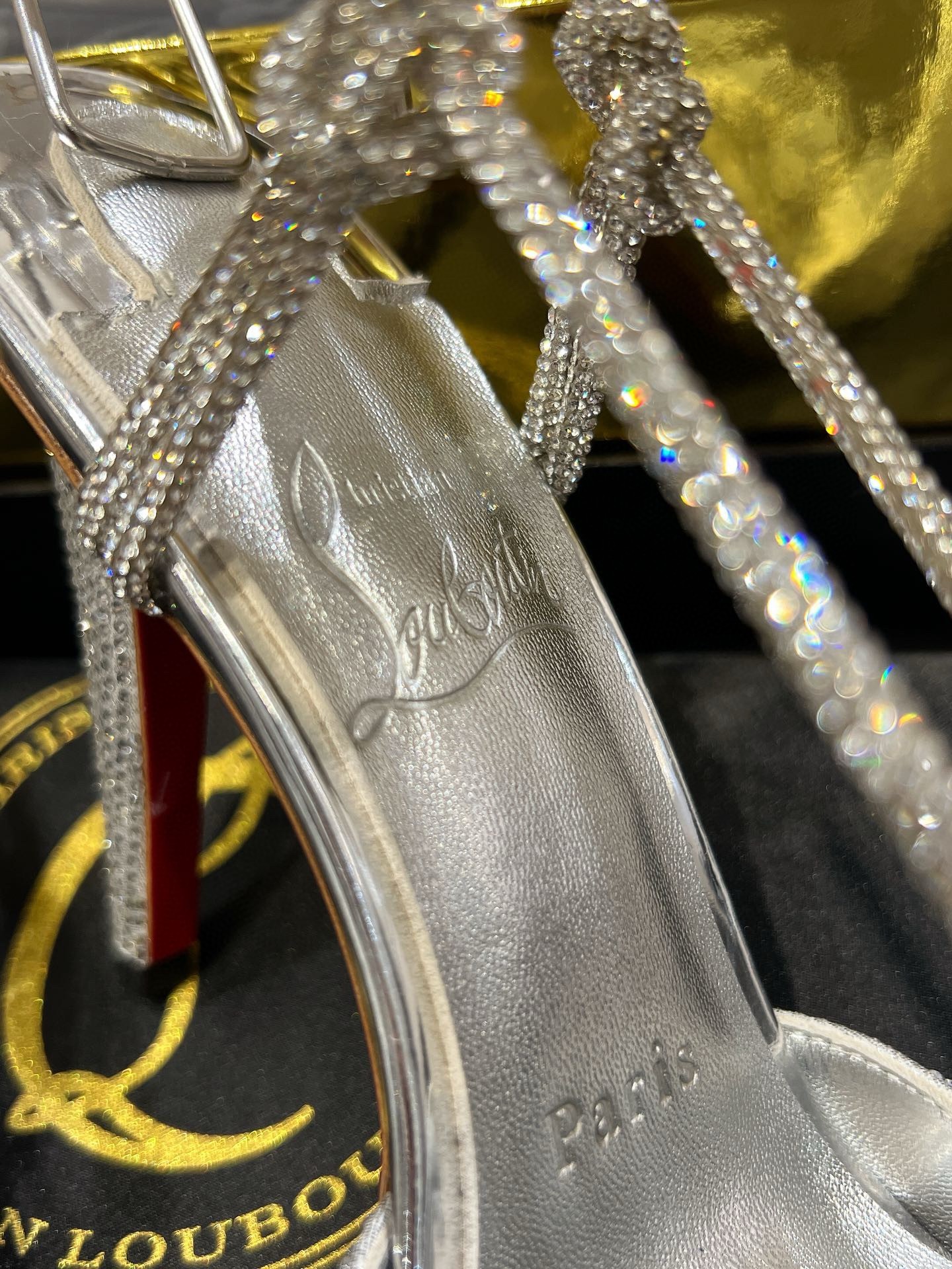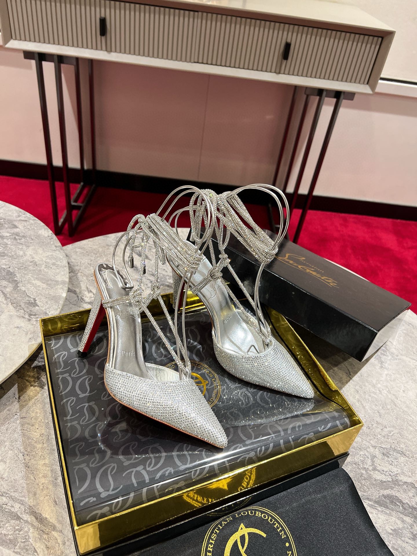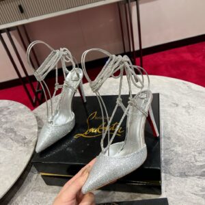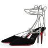 The architectural Astrid Lace Strassita pump enchants with sophisticated lines. This Maison Christian Louboutin model is crafted in mirror-effect silver suede calf leather. Its pointed toe and 85 mm heel are completely covered in silver strass. Long sequin laces tie around the ankle adding a hint of glamour.