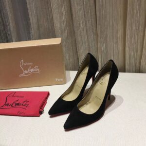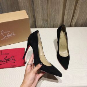 Christian Louboutin’s Kate sports a pointed toe leading to a clean arch and boldly ending on a high note with a 100mm stiletto heel. Featuring a low cut vamp that reveals toe cleavage—a woman’s second décolleté and a symbol of sensuality, these elegant black Veau Velours pumps give a sophisticated look and shape your gait into a jaw-dropping stride.