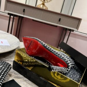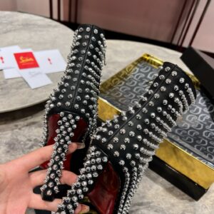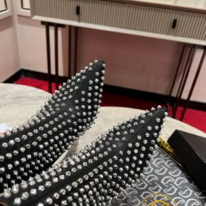 The Condora Booty has a pointed toe like a bird’s beak. This sophisticated boot in black leather comes high on the ankle. It features a 100 mm angled heel and is adorned with Maison Christian Louboutin’s signature spikes.