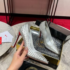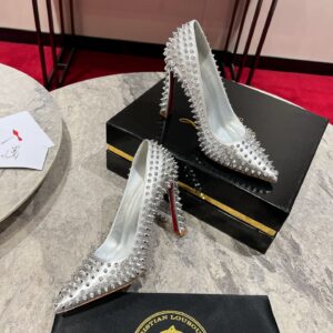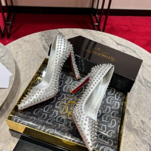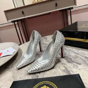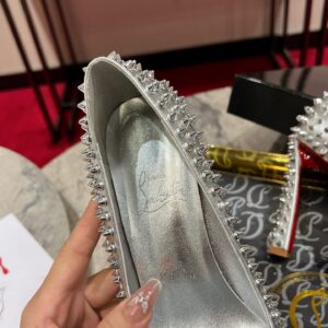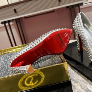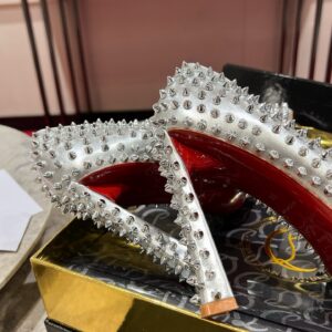 The latest design based on the iconic Maison Christian Louboutin Kate shape, the Condora Spikes is a bold representation of stand-out style. Completely adorned with spikes and set on an nappa leather silver base, this model rocks with attitude. Sitting on a towering 100 mm heel , each stride offers a glimpse of the timeless Loubi red sole.