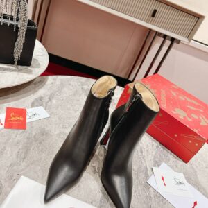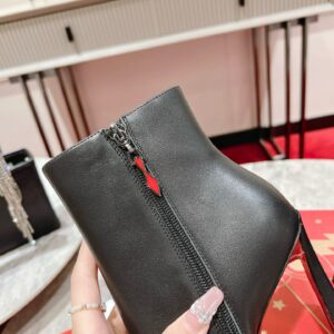 The sophisticated Condora Booty is an iconic shoe from Maison Christian Louboutin. Set on a 100 mm flared graphic plume heel, imbuing it with a modern yet contemporary allure and revealing the emblematic red sole. It is designed in premium black leather, fits the leg like a glove, and is embellished with an internal zip to elongate the silhouette. The pointed toe and delicate finishes enhance the model’s sleek and refined silhouette, making this an ideal match for any pants or skirt.