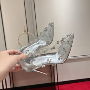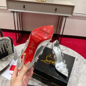 A new twist on the Degrasstrass pump, the Degraqueen pump features the same 85 mm stiletto heel, transparent PVC upper, and a pointed open toe. As part of the Strass Up collection, this modern model is adorned with Maison Christian Louboutin’s latest take on jewels and strass – bigger, bolder crystals, each handsewn onto the PVC upper. The heel and lining are crafted in nappa laminata leather.