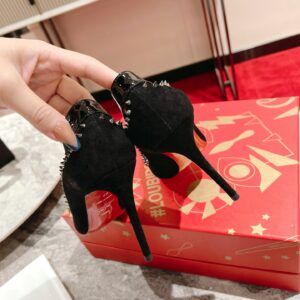 The Duvette Spikes pump enchants with sophisticated lines and a pointed toe. Set on an 85 mm heel, this black shoe is crafted in veau velours and nappa leather. It also features a discreet notch at the back and is adorned with signature Maison Christian Louboutin tonal spikes.