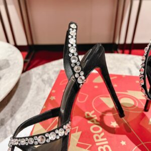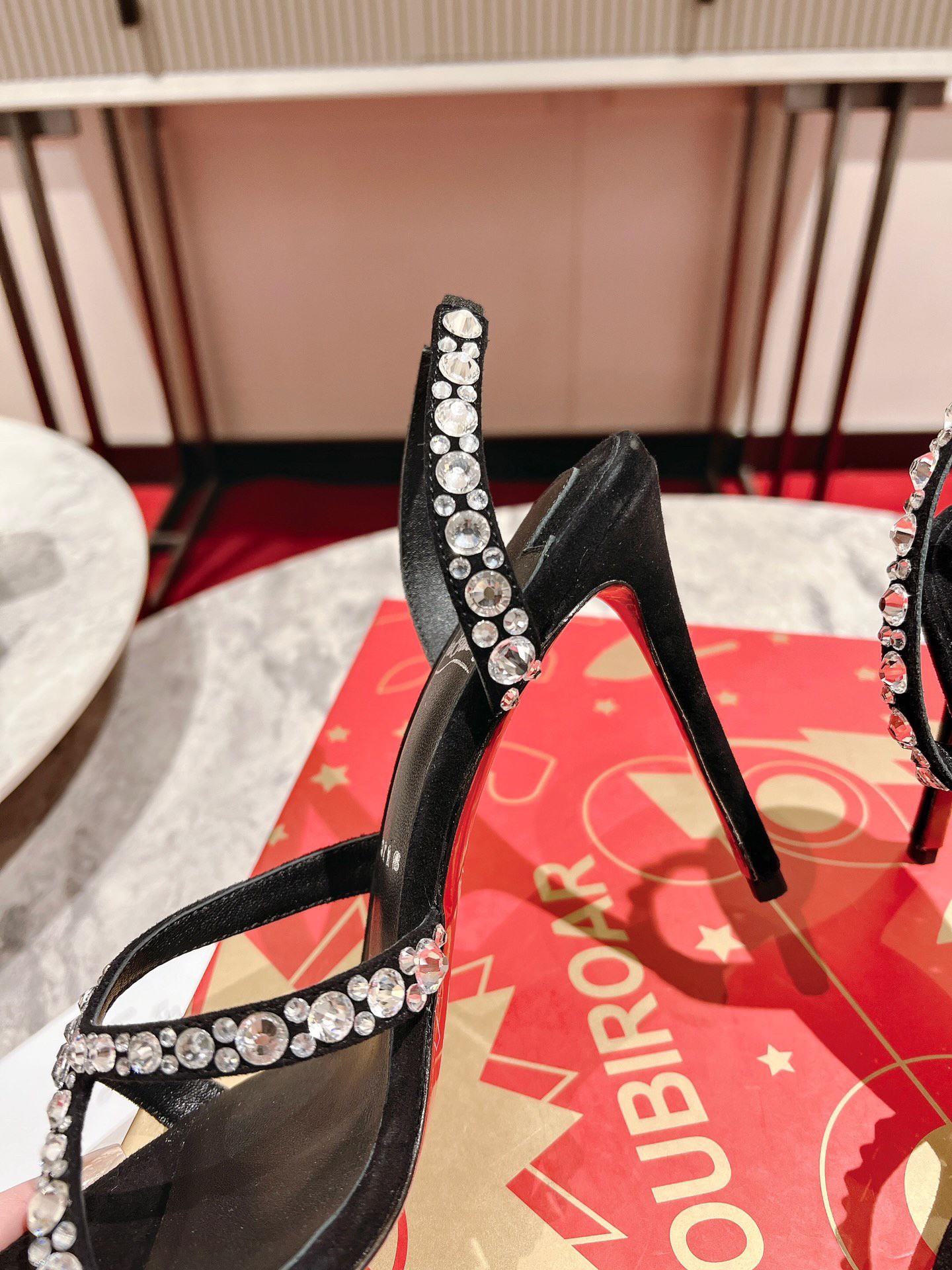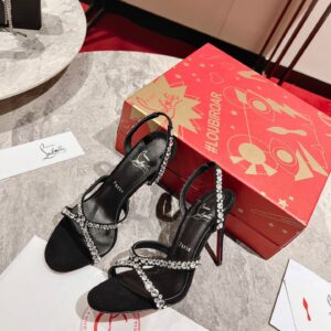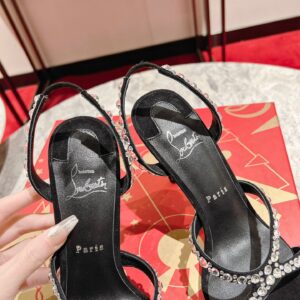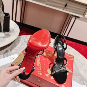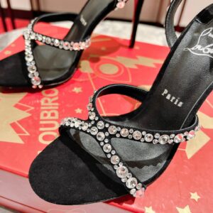 The Emilie strass is a sleek sandal that delicately reveals the foot. It has straps that cross over the front of the foot, showcasing Maison Christian Louboutin’s sophistication. Crafted entirely in black veau velours and featuring a 100 mm heel, this model is adorned with a myriad of strass in different sizes. The slender ankle strap is elasticated.