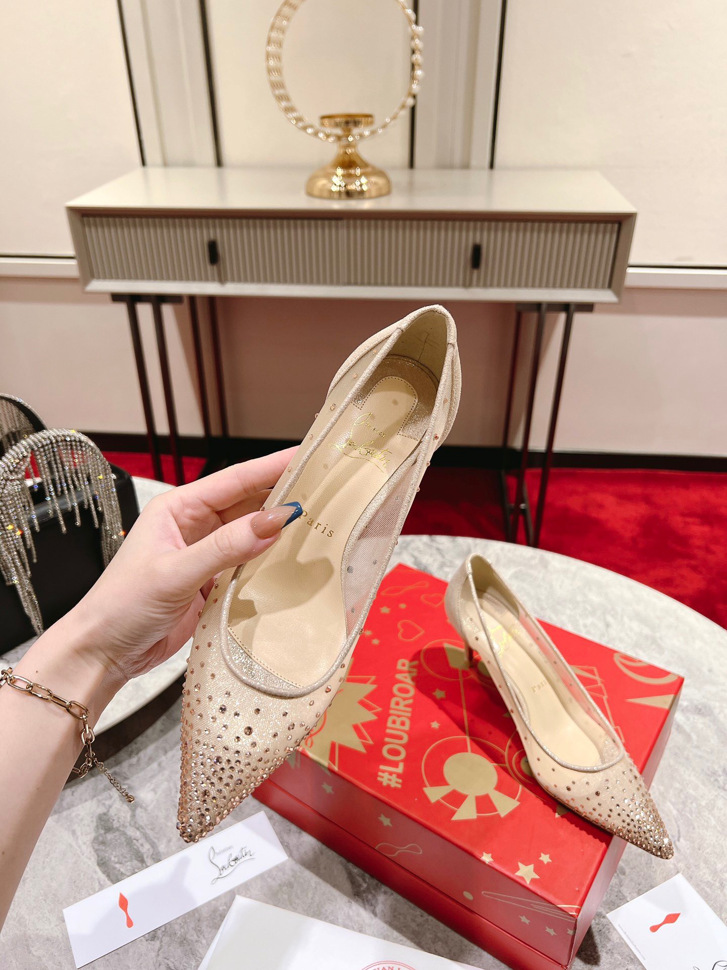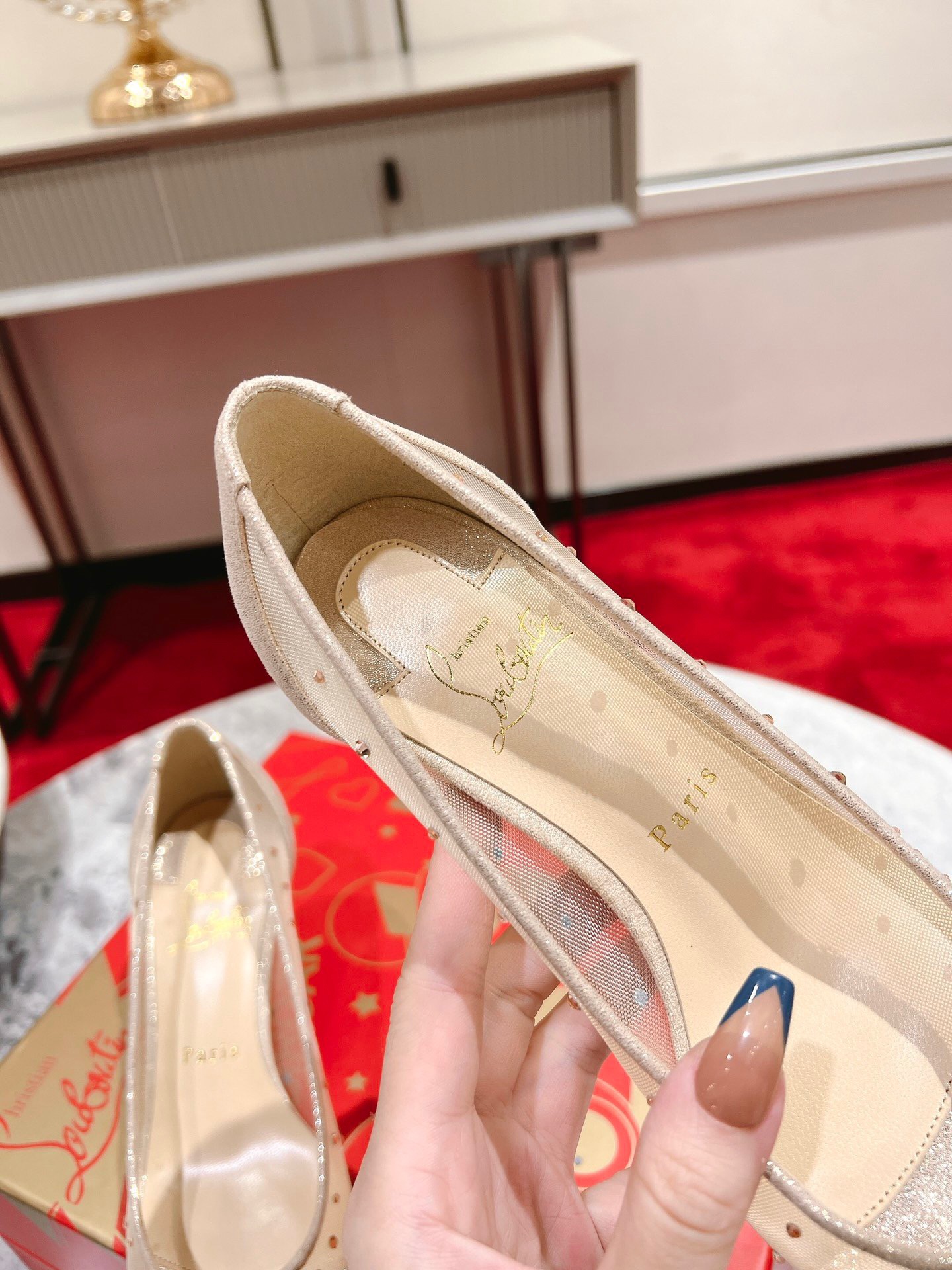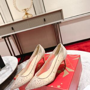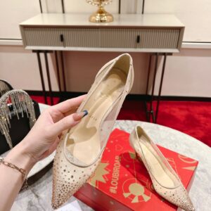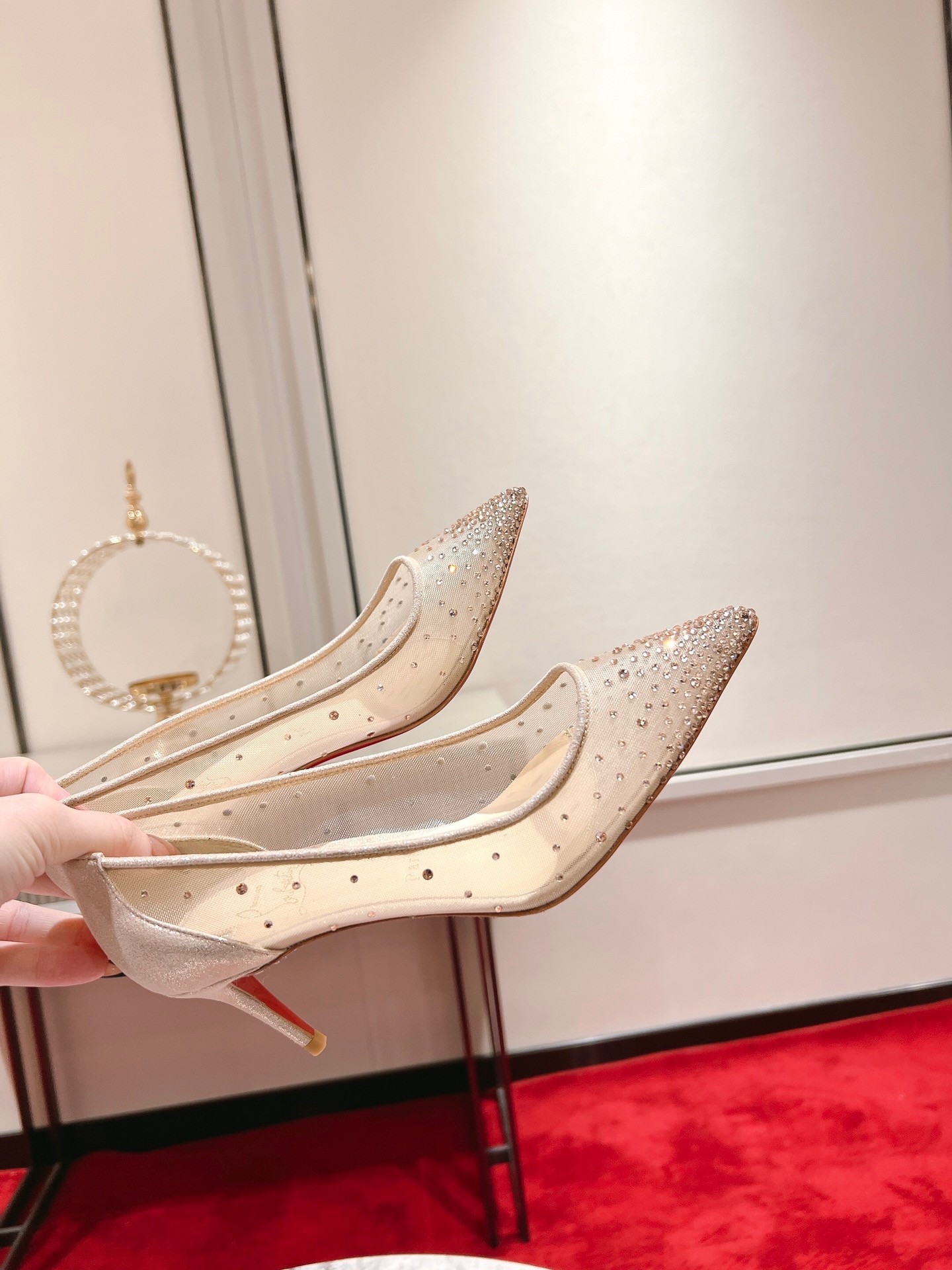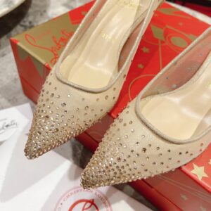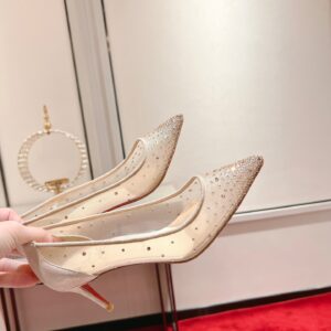 An icon of the Maison Christian Louboutin, the Follies Strass pump is inspired this season from the stellar universe. In transparent fishnet, it adorns the foot with iridescent strass. Its heel counter and 70mm of heel are dressed in shiny suede lamé.