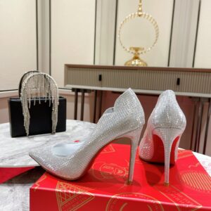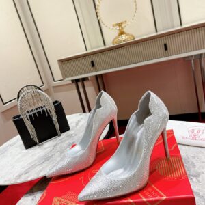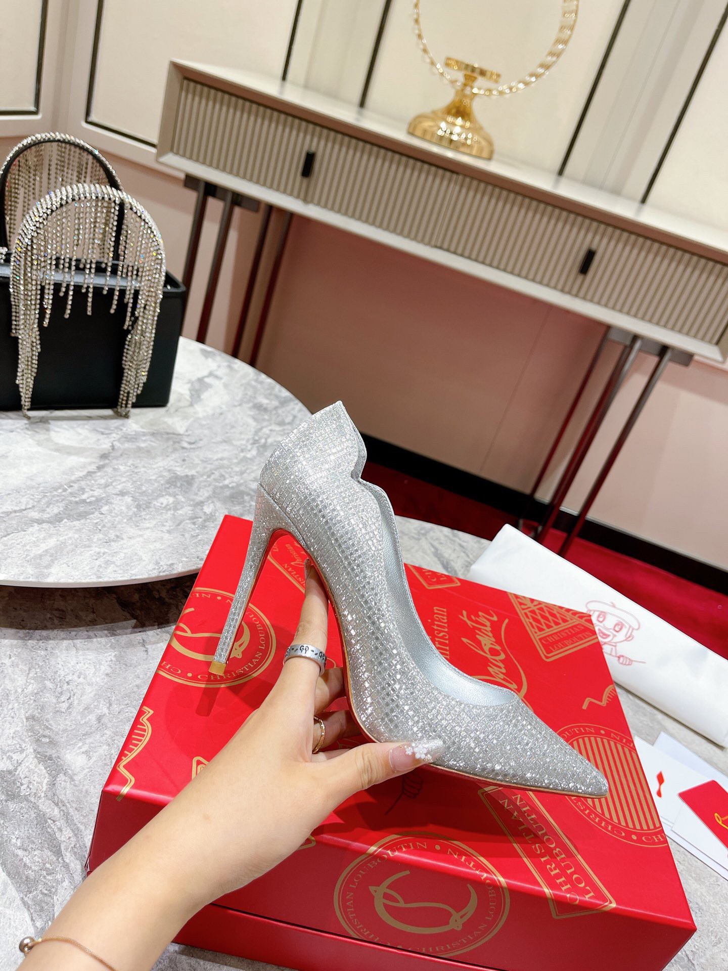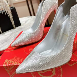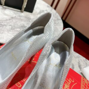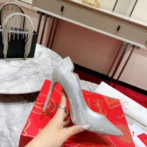 The Hot Chick pump is an iconic Maison Christian Louboutin design and stands out thanks to a wide, plunging vamp enhanced by a pointed toe and V-shaped notches under the ankle. Set on a 100 mm heel, the striking delicacy of its finishes highlight its tone-on-tone insole. This pump exudes sophistication thanks to its embossed silver sequin finish, for an elegant, timeless style.