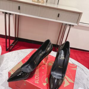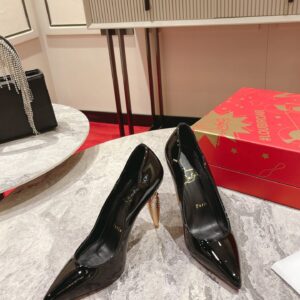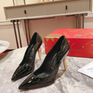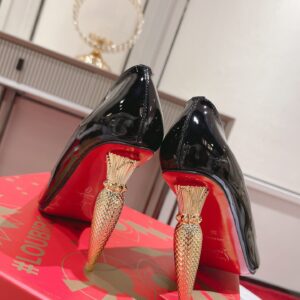 The Lipchick Pump features V-shaped notches below the ankle. This model is part of the Loubi Mystery capsule, inspired by designer Yaz Bukey’s Turkish origins, and the board game, Clue. With its audacious low-cut vamp, elegantly revealing the foot, it is crafted in black patent leather. This pump has a 100 mm gold heel. A captivating design evoking Maison Christian Louboutin’s iconic red lipstick.