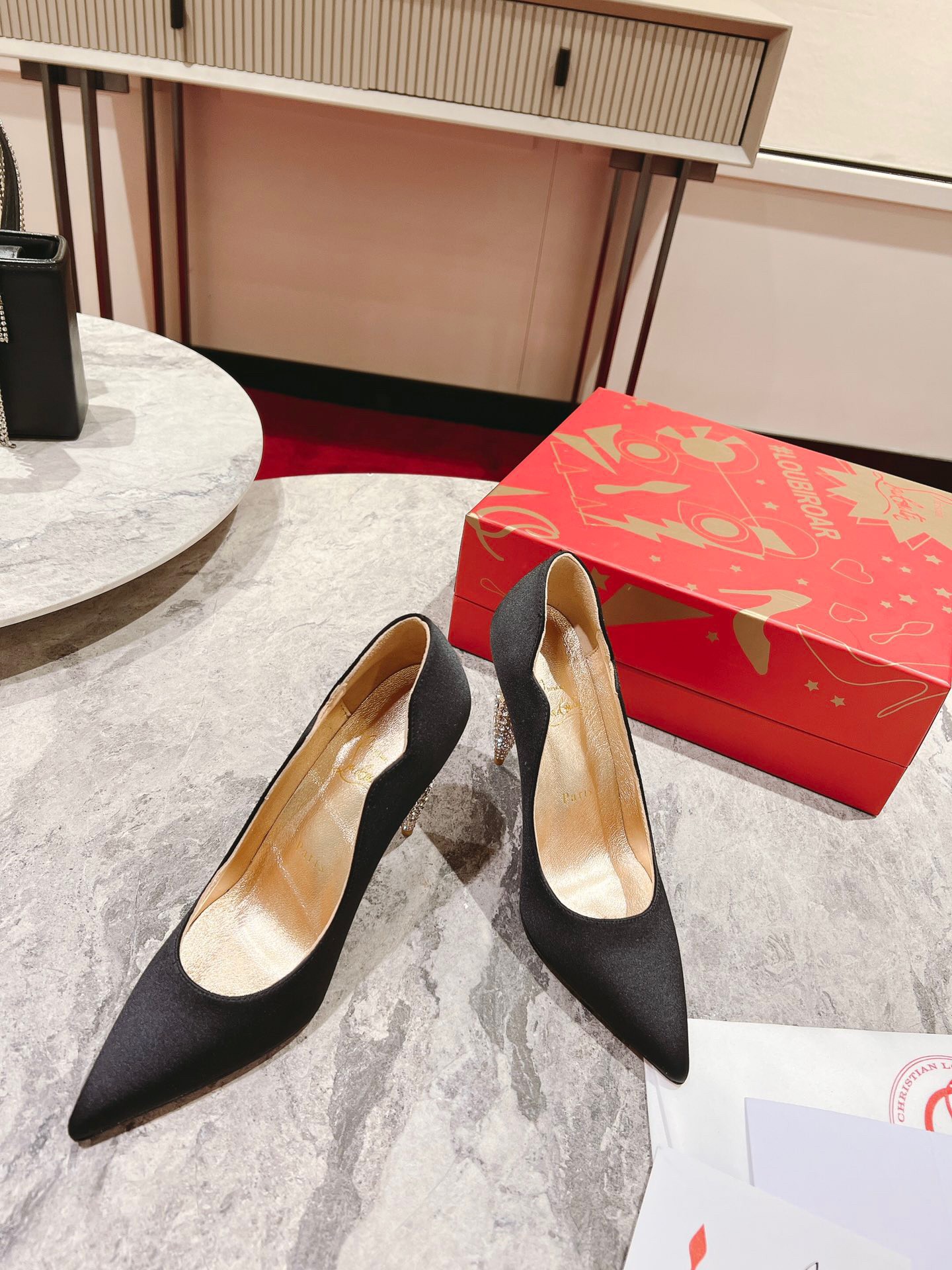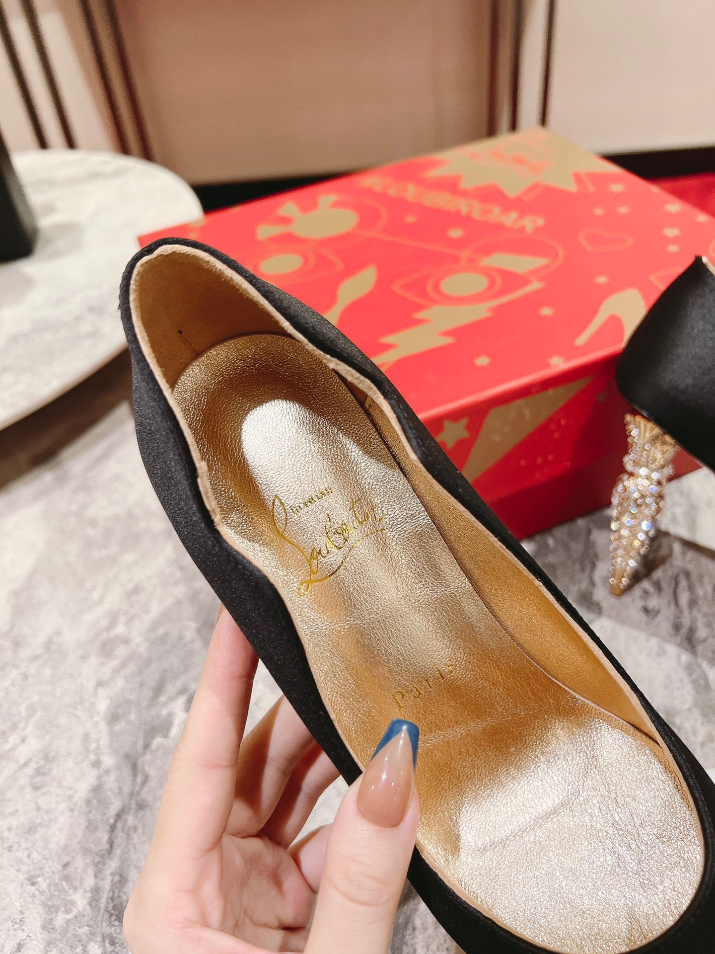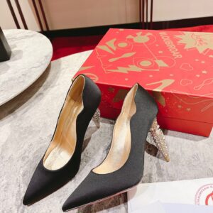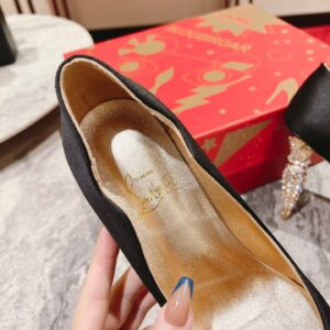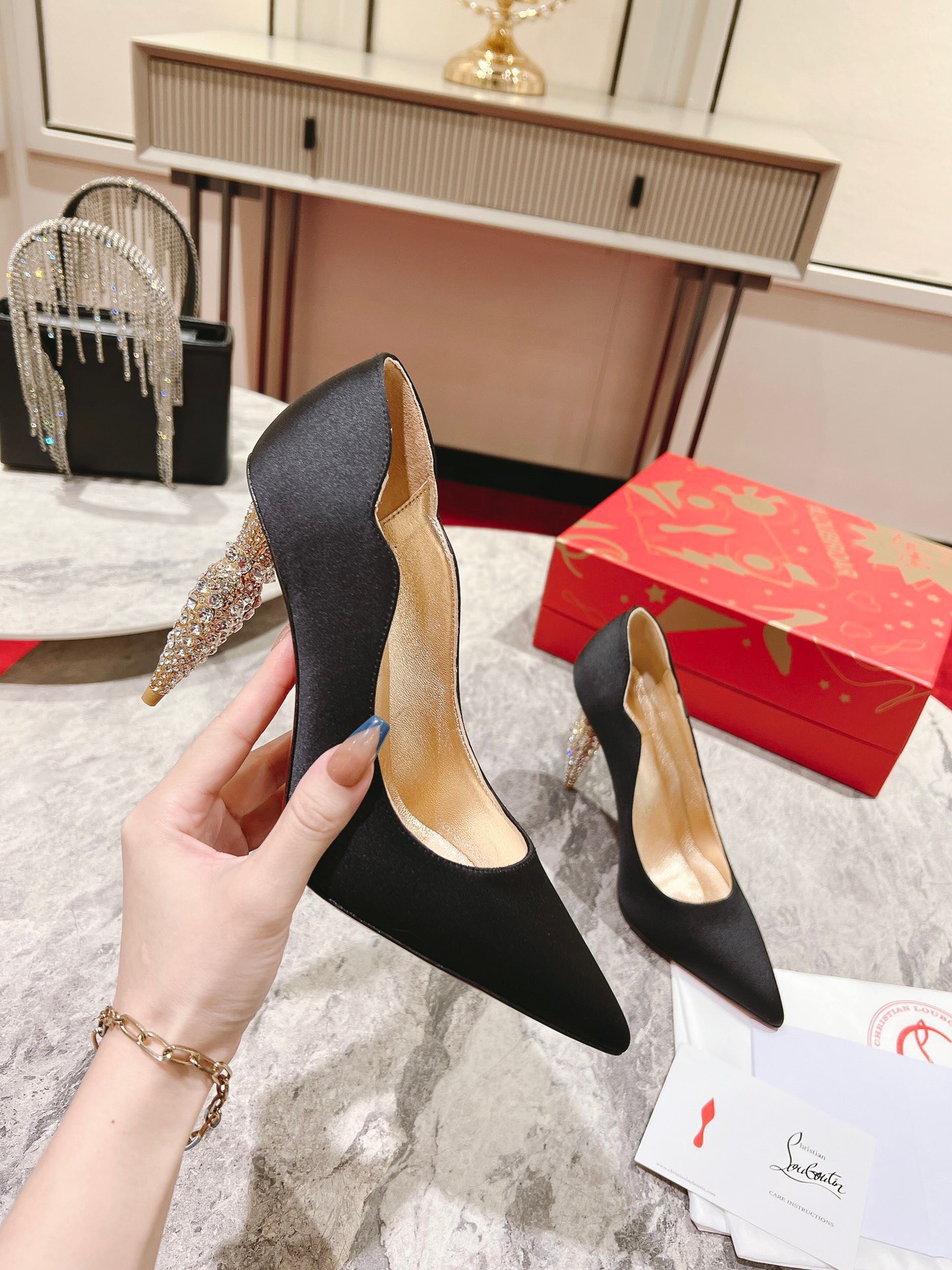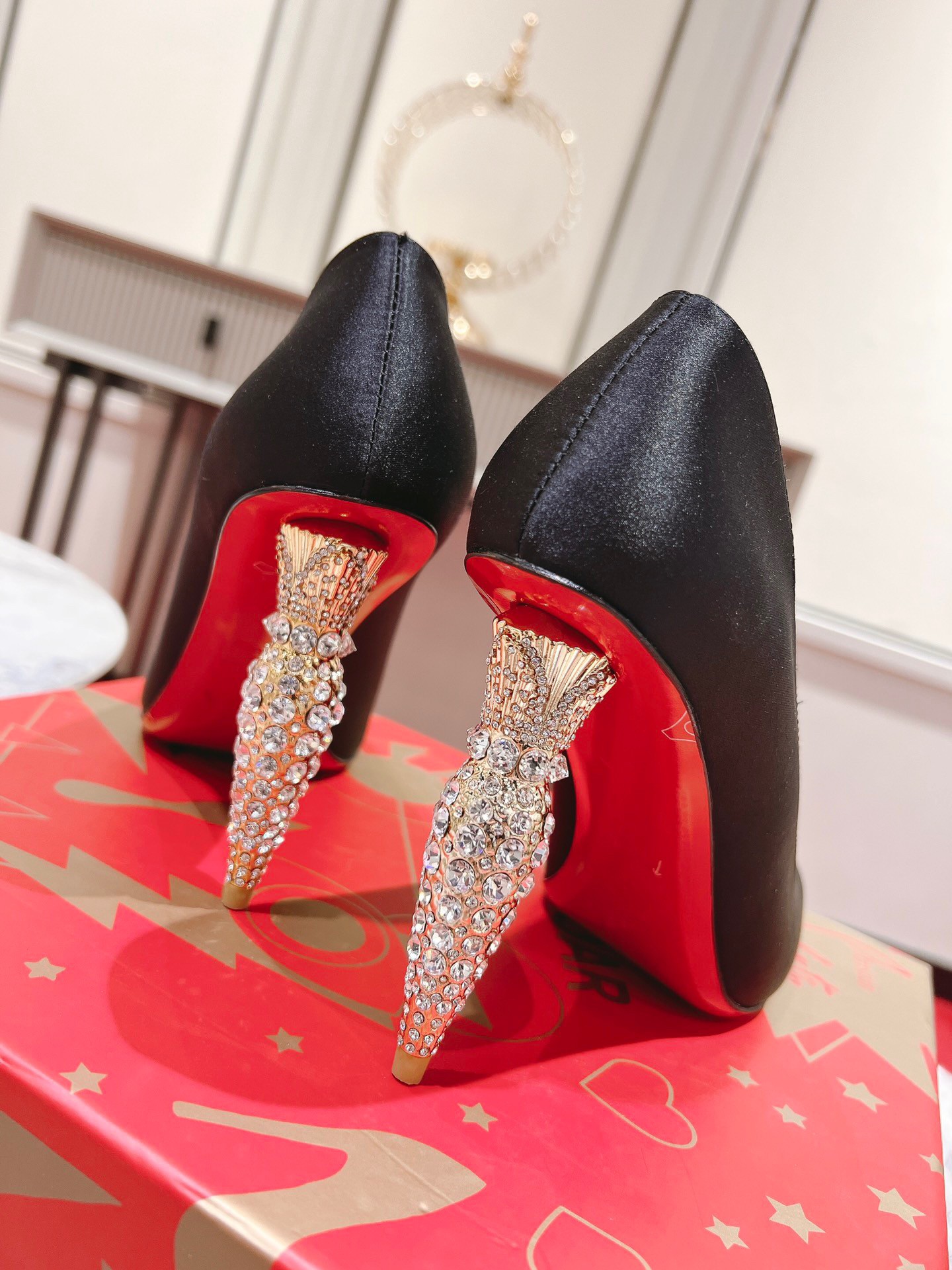 Highlighting the ankle with heart-shaped cut-out notches, the Lipstrass Pump exudes timeless elegance. It is entirely crafted in black crêpe satin with gold lining and a pointed toe. This graphic pump has a 100 mm gold heel. A captivating design enhanced with hand-placed strass, evoking Maison Christian Louboutin’s iconic red lipstick inspired by Egyptian columns.