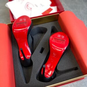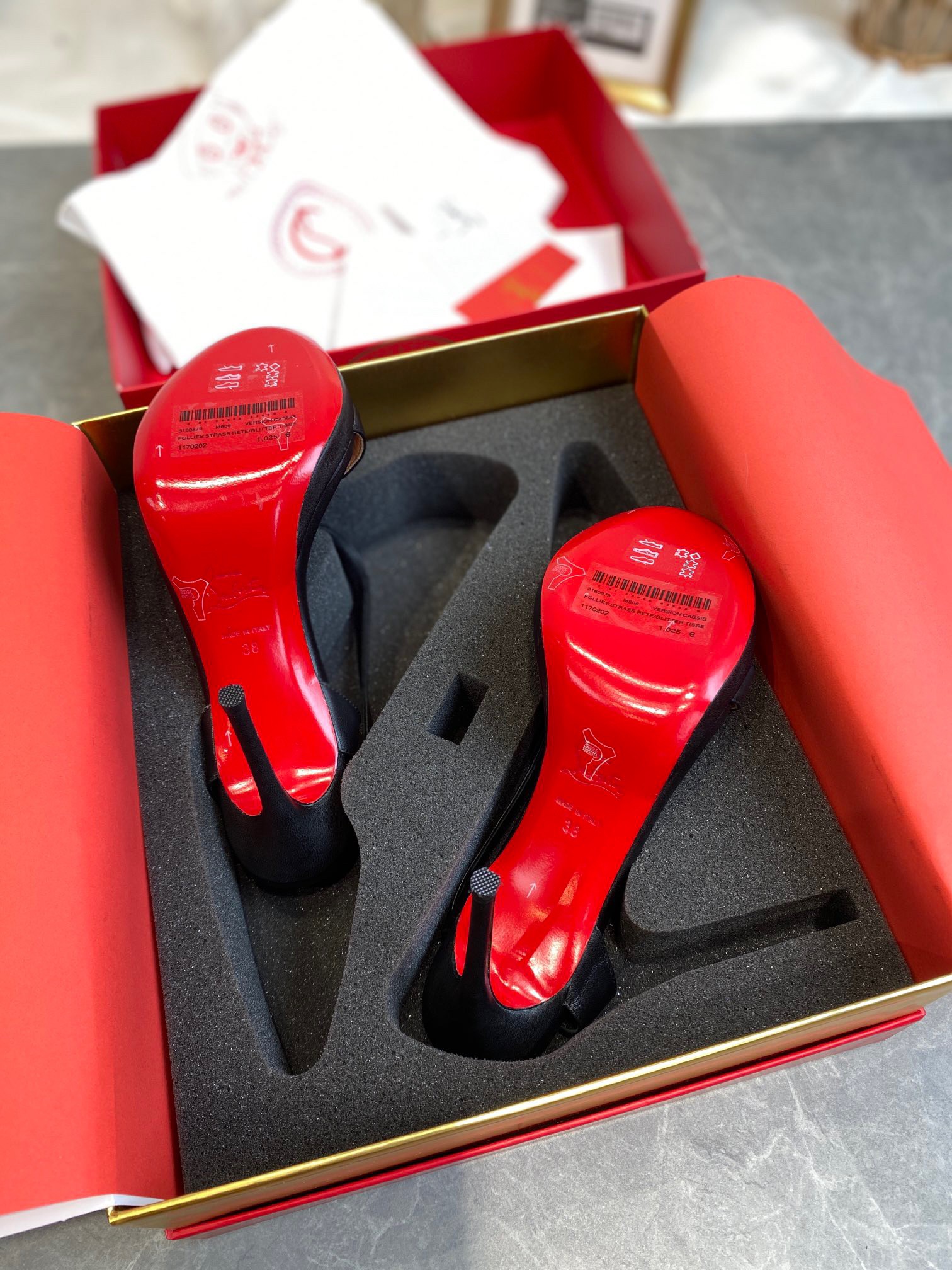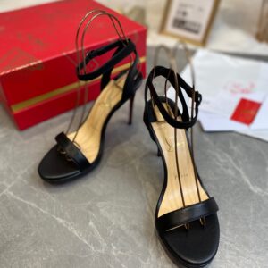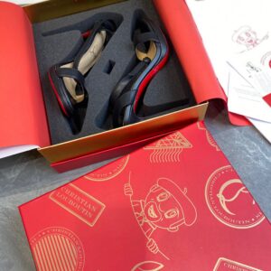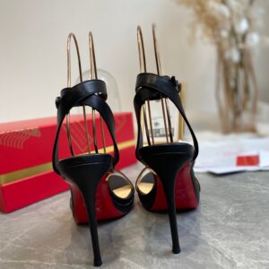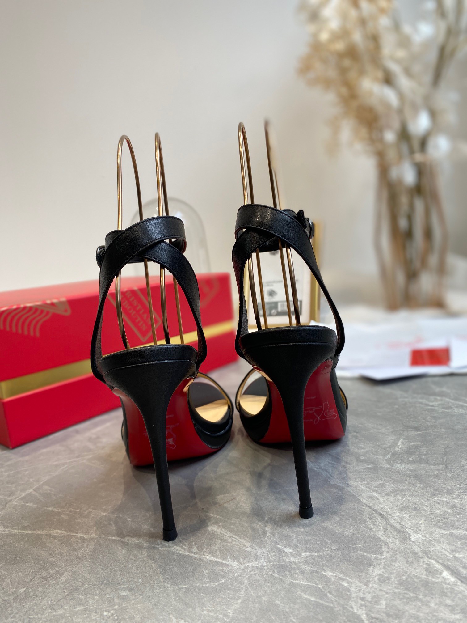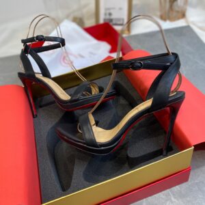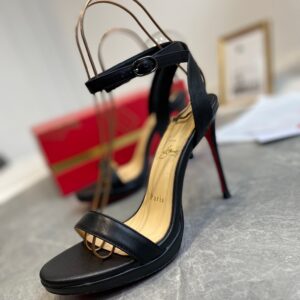 A slim platform and lofty 120mm wrapped stiletto add leg-lengthening lift to Christian Louboutin’s Loubi Queen in nappa leather. The open toe sandal is an elegant minimalist look that finds inspiration in traditional French cabaret. A graceful ankle strap, recalling the world of beautiful dancers and choker necklaces, is anchored with two thin straps reaching around and under the naked heel for added glamour.