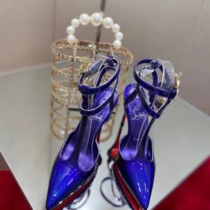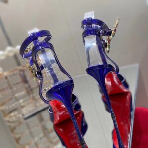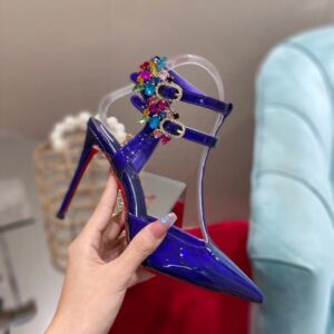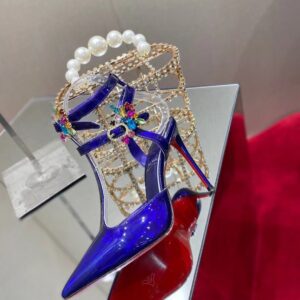 The elegant and stylish Maravilla pump has an irresistibly sophisticated look. This Maison Christian Louboutin shoe is set on a 100 mm heel and is designed in Elektra blue mirror-effect leather. It has two adjustable straps set with silver buckles and multicolored strass that delicately encircle the ankle.