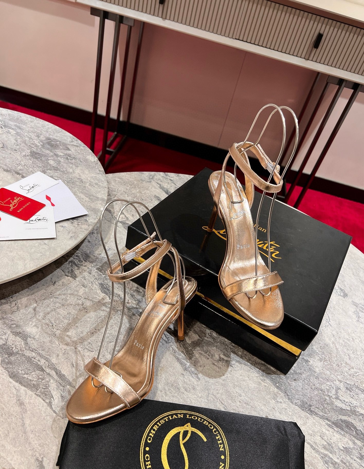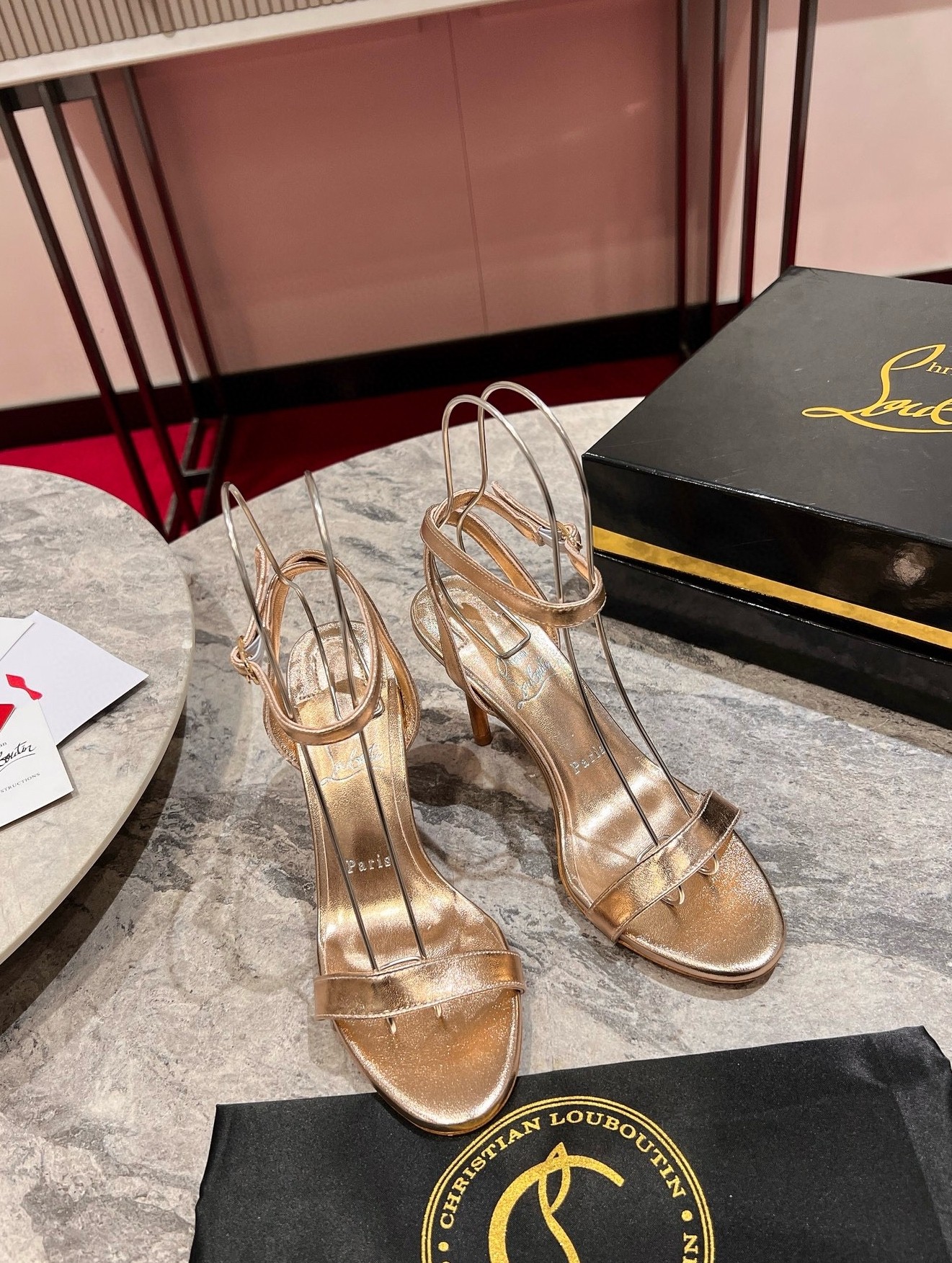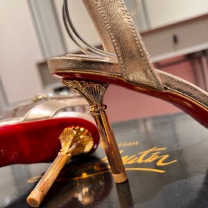 The Mascasandal features an 85 mm jewel-like heel inspired by Maison Christian Louboutin’s mascara case, crafted in the image of ancient columns with a gold finish. The sandal’s sleek, elegant design, with slim straps across the toe and around the ankle, shows off the heel in its full splendor. This model is crafted in Leche beige laminated leather.