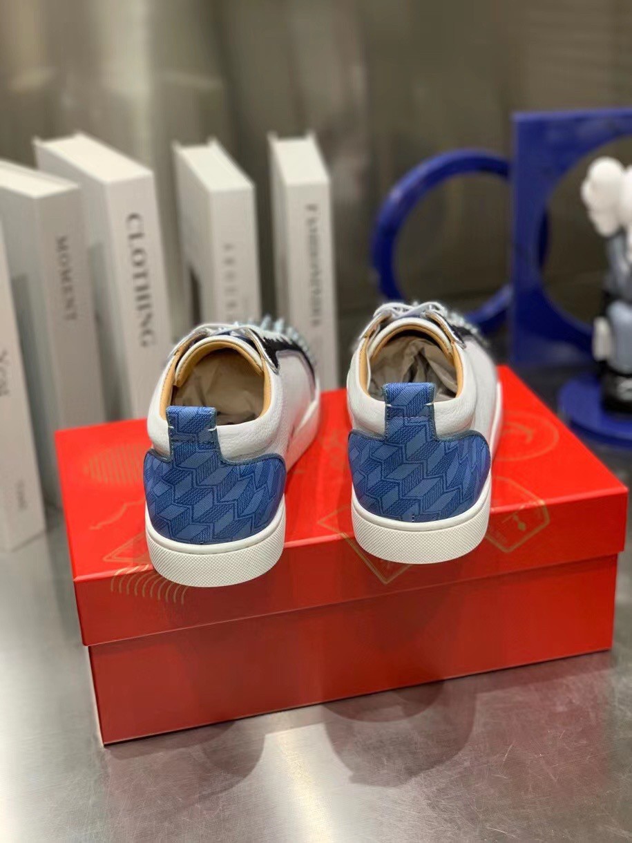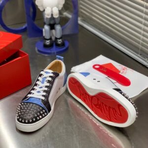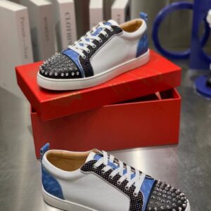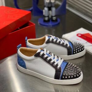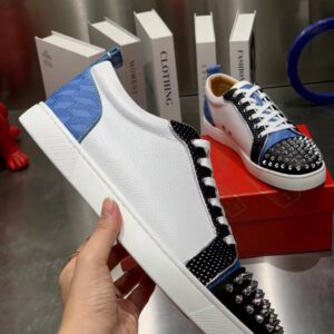 The Louis Junior Spikes Orlato low-top sneaker is inspired by the world of basketball and is mounted on a white rubber sole. With elegant and sporty lines, the vamp plays with textures, combining black and white calfskin with a plumetis fabric and a blue neoprene with a geometric pattern. It is enhanced with a discreet trim and the toe sports the Maison’s signature silver spikes.
