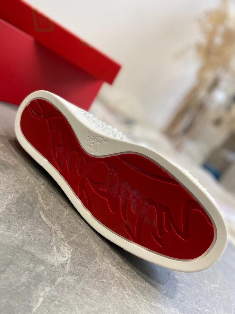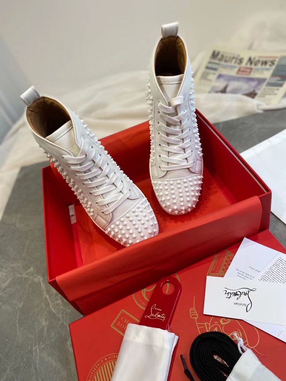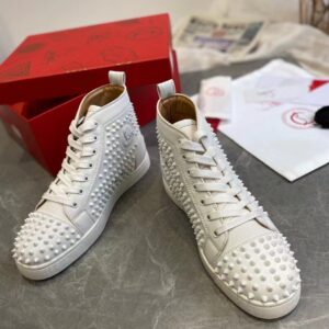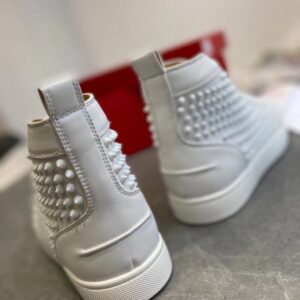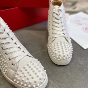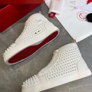 Christian Louboutin’s white calfskin Louis high-top sneakers are decorated with a covering of tonal signature spikes on the upper. The sophisticated and minimalist pair, with topstitching detail and a further stitched scar on the back counter, made their debut in 2009 and the designer has since been coming up with new iterations. They feature a deep toe box and work seamlessly with all of your on or off-duty looks.