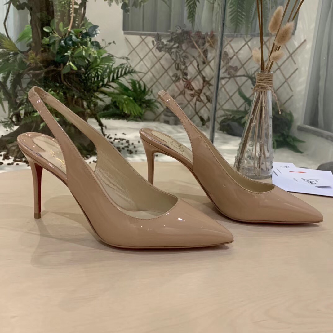 The Clare Sling pointy-toe pump is covered in glossy patent leather and adjusts with an elastic slingback strap on an 80mm stiletto heel. Its low-cut décolleté reveals with modernity, the expertise of the Louboutin House.