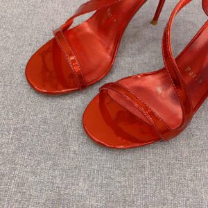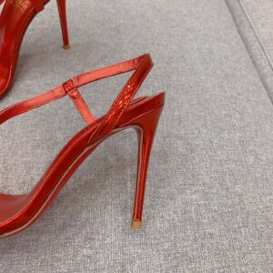 Simplicity and refinement are combined in the Rosalie, a contemporary take on the classic stiletto sandal. The upper incorporates an innovative design, formed of a narrow strap with a two-piece construction, supported by a post strap. Starting in a sling-back, this strap winds around the foot, ending in a wavy design over the toe. This understated version comes in shinny patent leather with a slender 100 mm stiletto heel.
