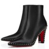 The Santiagag ankle boot has an innovative Wild West-inspired design. This model is crafted in Lionne brown veau velours and features a pointed toe and elasticated panels covered by strips of leather. It is set on an 85 mm heel and is adorned with a silver Maison Christian Louboutin signature spike.