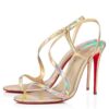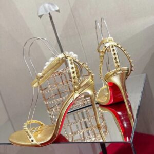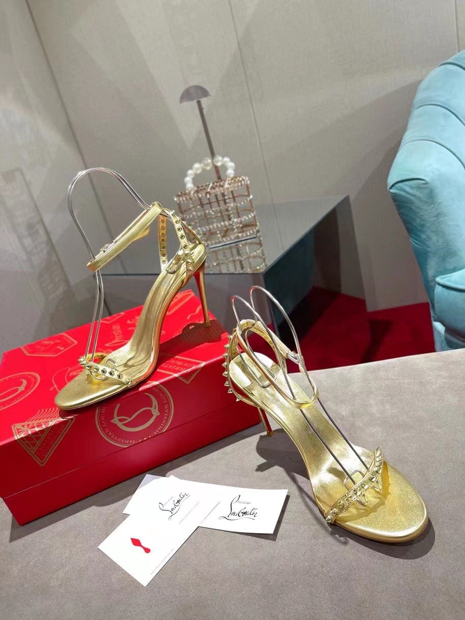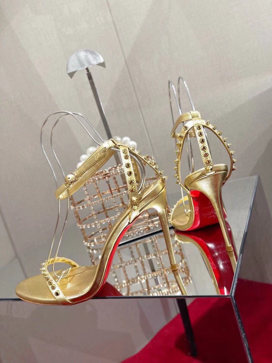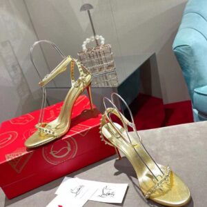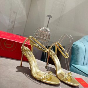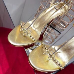 Channel your best self in the So Me, inspired by the iconic Loubi Queen. For this season, this edgy eveningwear sandal has been worked in gold calf leather, complimented by a silver linen lining. For a punk twist, this model features a mix of plain and spike-embellished straps. The delicate upper sits over a 100 mm wrapped stiletto heel and flat sole for pure, simple elegance.