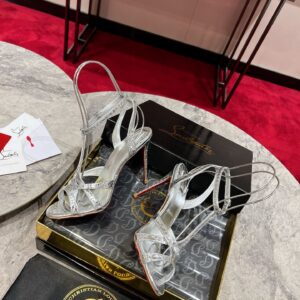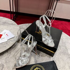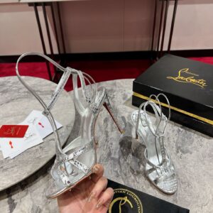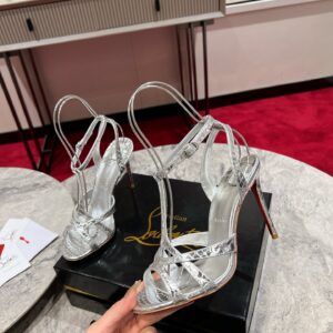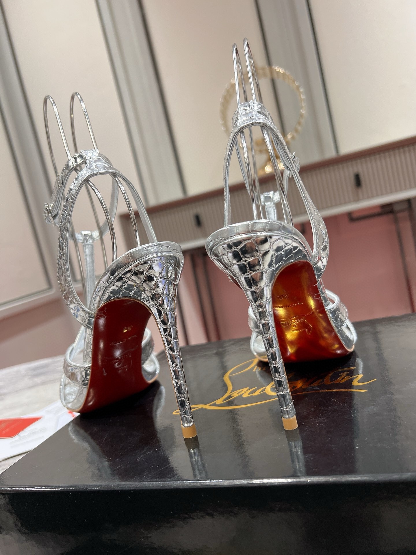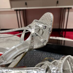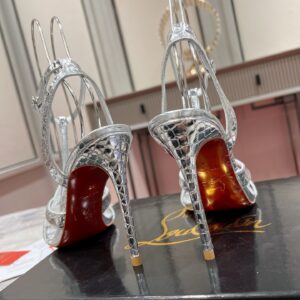 With its plunging vamp, the Tangueva sandal elegantly reveals the foot. This Maison Christian Louboutin model is crafted in iridescent silver calf leather with a textured scale effect. It sits on a 100 mm heel with a small platform and has straps at the front creating a graphic effect. This sophisticated model has a metallic clasp on the side.