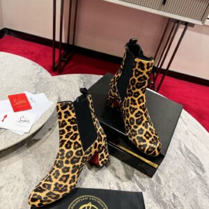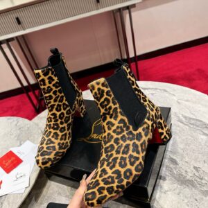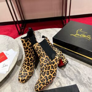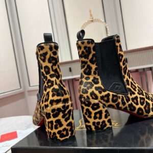 An ankle boot with a sophisticated silhouette, the Turelastic features a chunky 55 mm angled heel. Showcasing clean lines that epitomize Maison Christian Louboutin’s elegance, it is crafted in smooth brown leather with a Pony Kitty leopard print. It has a curved toe and features an elastic insert on the side, enhanced with an embossed CL varsity logo.