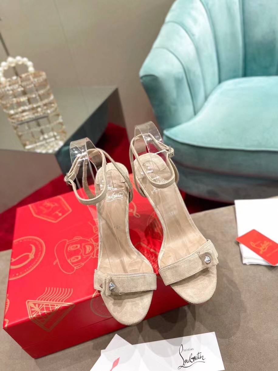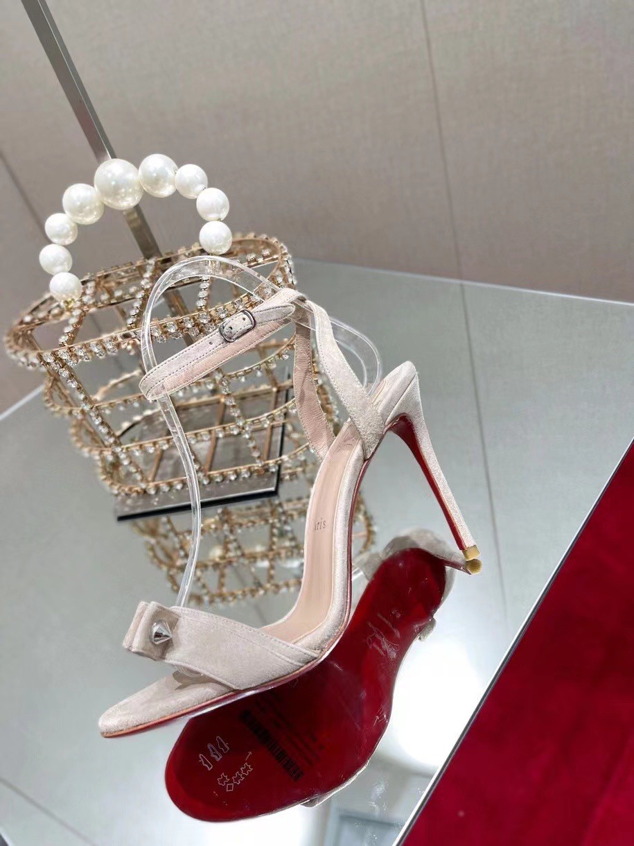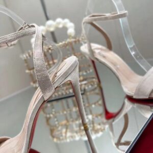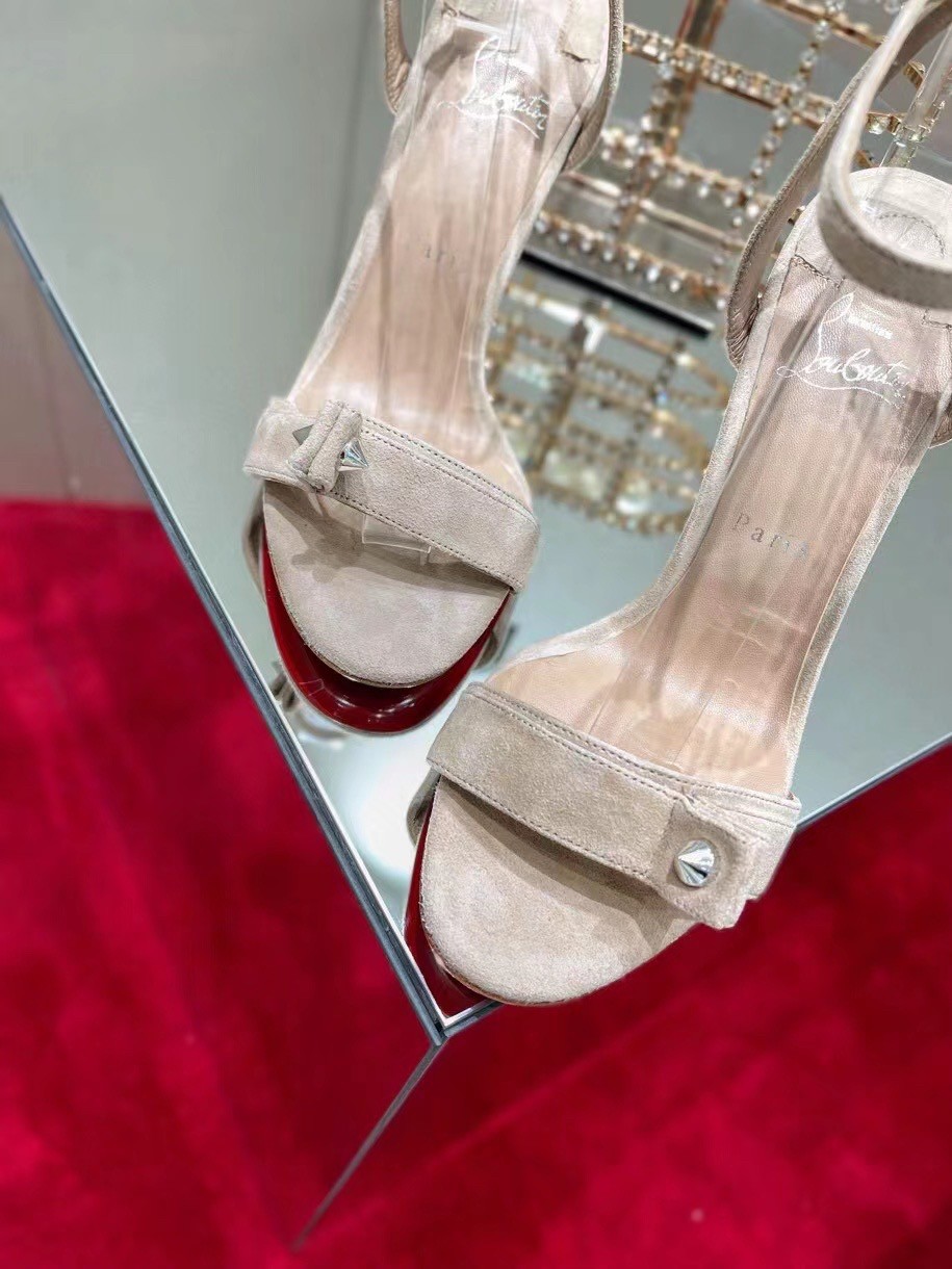 The timeless Umberta sandal dresses the foot with elegance and refinement. This model is set high on a 100 mm heel and is designed in Fève beige calfskin suede. The strap is pleated and embellished with two Maison Christian Louboutin signature silver spikes. This shoe is fitted with a fine strap that gracefully encircles the ankle and offers irresistibly sophisticated style.