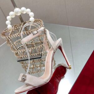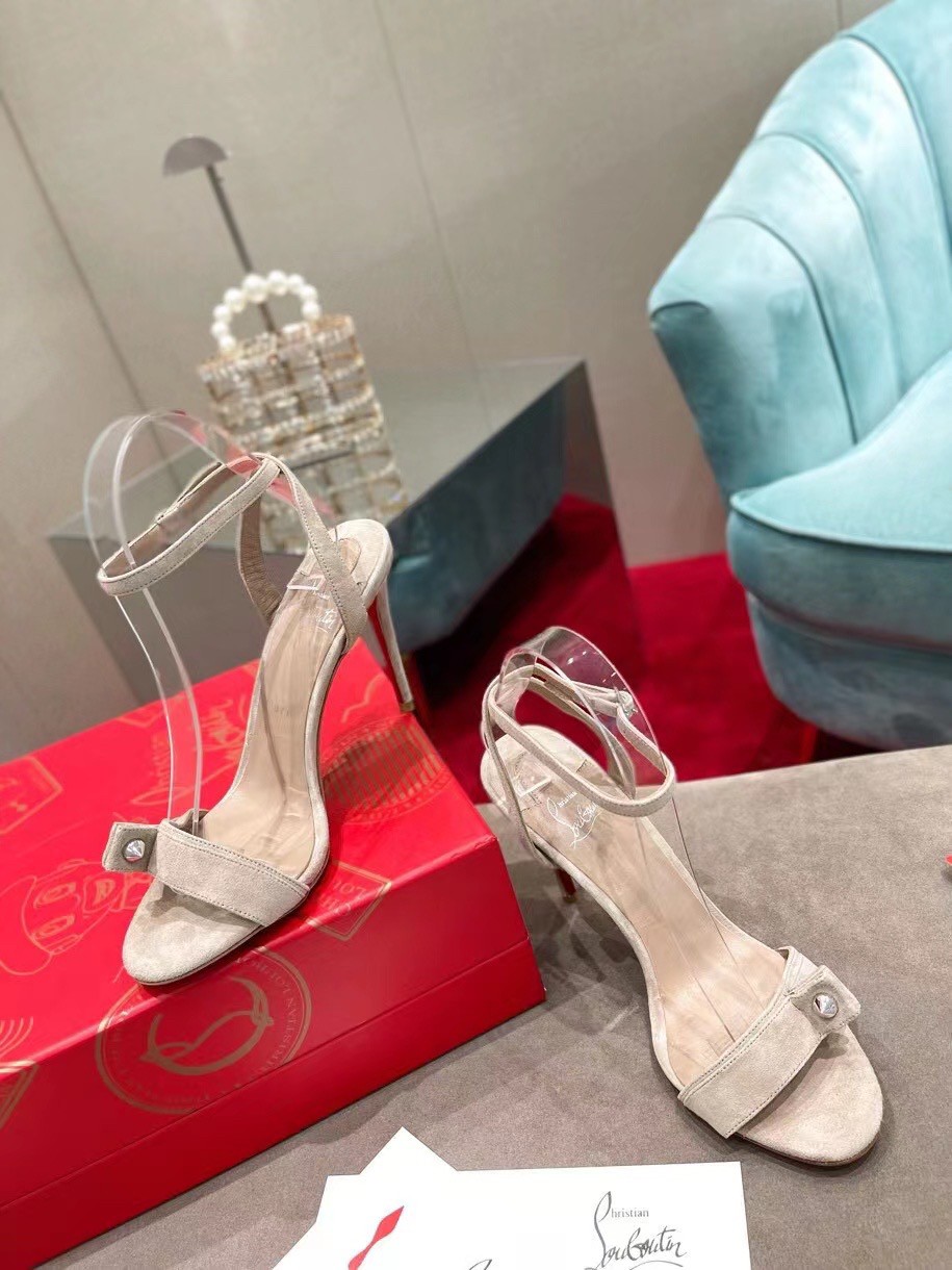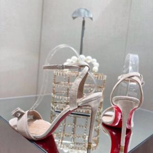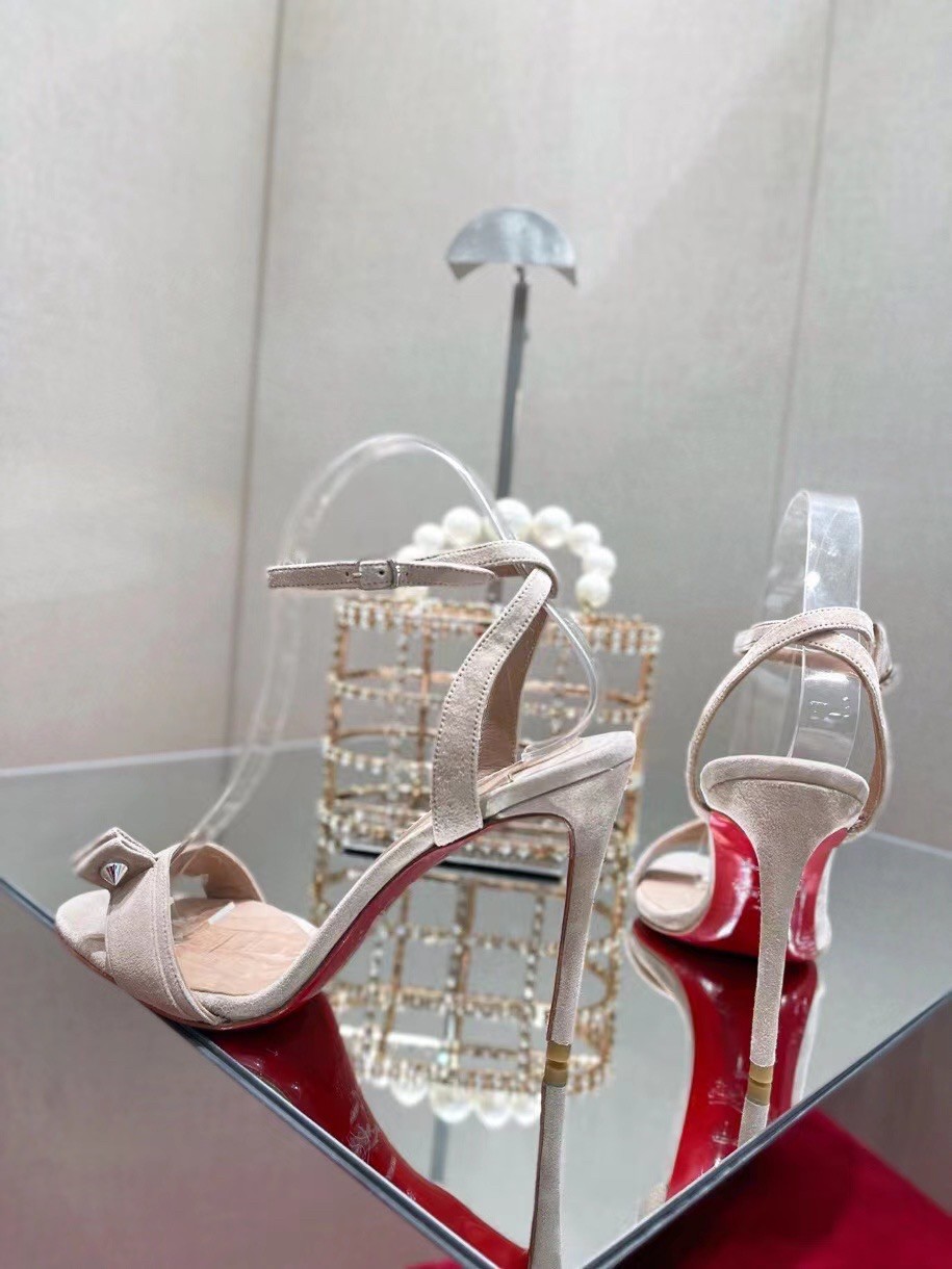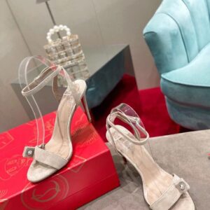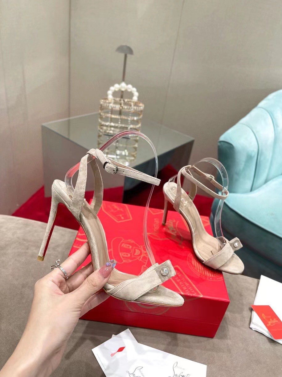 The timeless Umberta sandal dresses the foot with elegance and refinement. This model is set high on a 100 mm heel and is designed in Fève beige calfskin suede. The strap is pleated and embellished with two Maison Christian Louboutin signature silver spikes. This shoe is fitted with a fine strap that gracefully encircles the ankle and offers irresistibly sophisticated style.