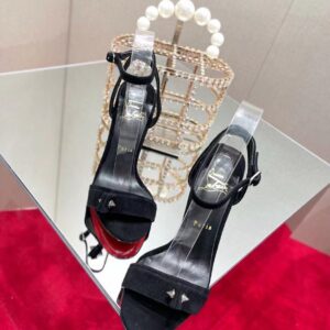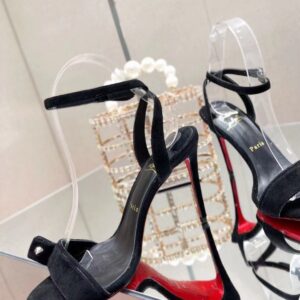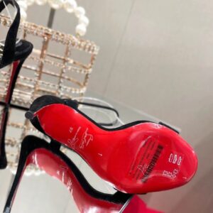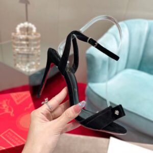 The timeless Umberta sandal dresses the foot with elegance and refinement. This model is set high on a 100 mm heel and is designed in black calfskin suede. The strap is pleated and embellished with two Maison Christian Louboutin signature silver spikes. This shoe is fitted with a fine strap that gracefully encircles the ankle and offers irresistibly sophisticated style.