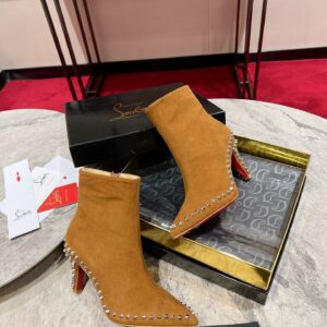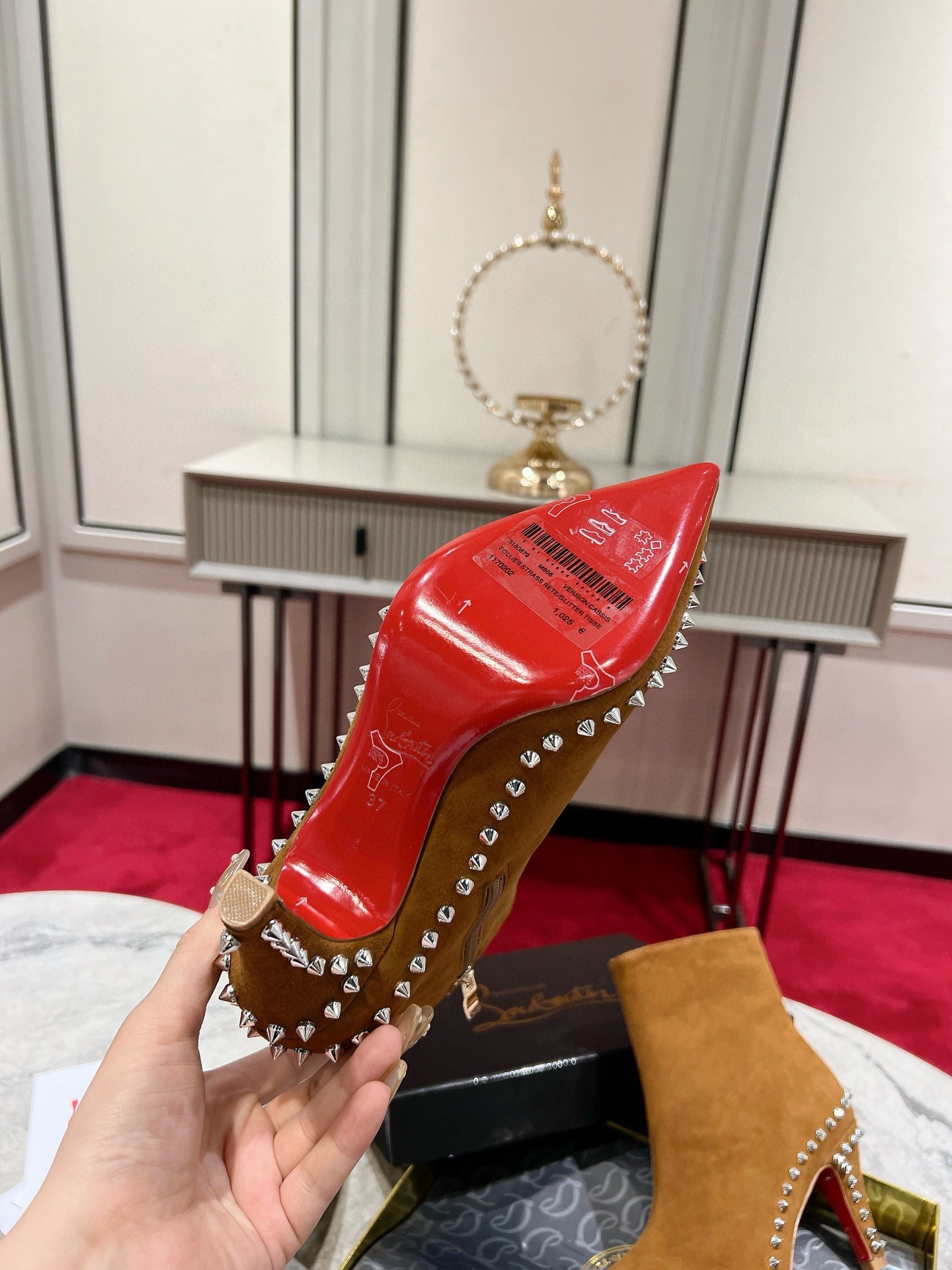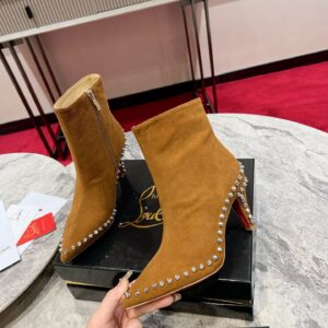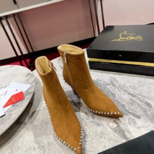 An ankle boot with a pointed toe, the Vidura Booty exudes sophistication. Crafted in brown suede leather, this model has sleek, elegant, urban lines. It has an 85 mm angled heel and the sole and heel are outlined with a row of Maison Christian Louboutin signature metal spikes.