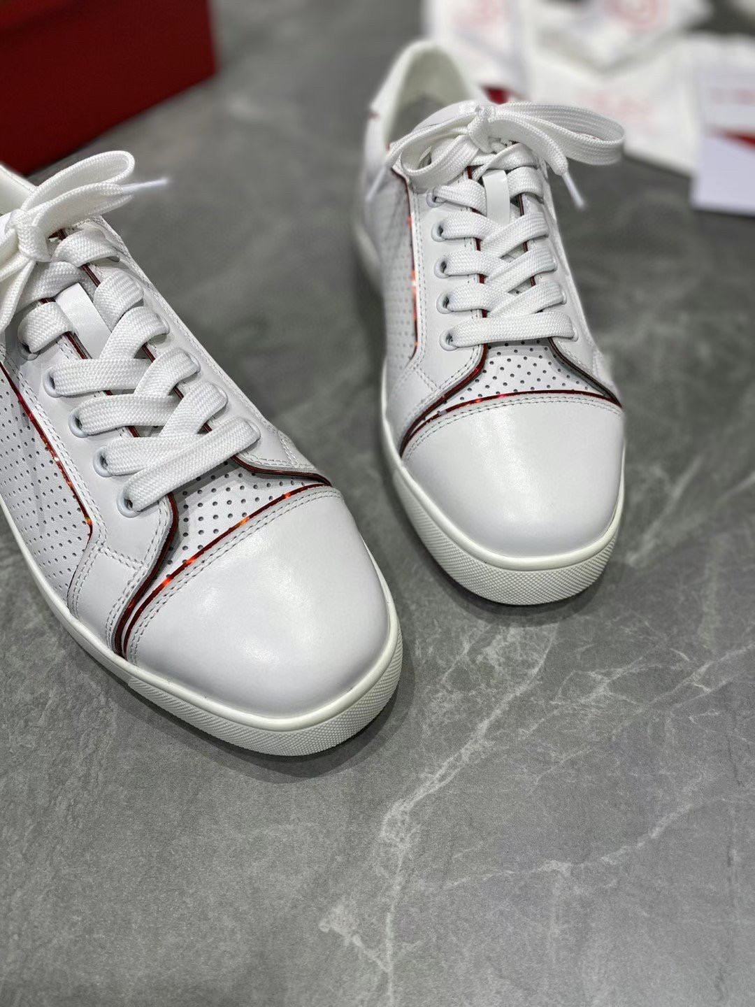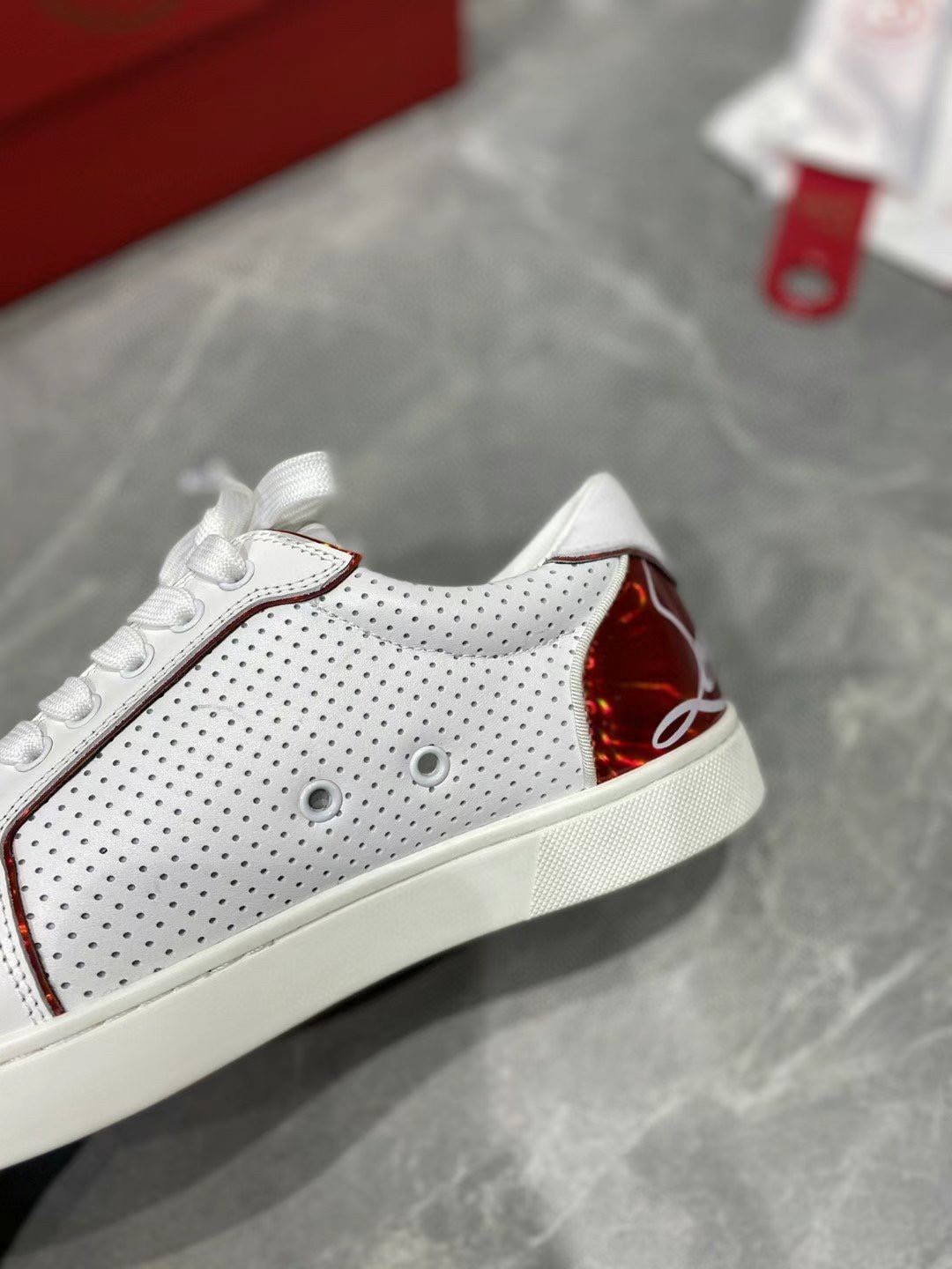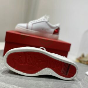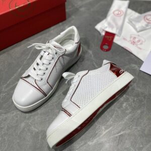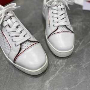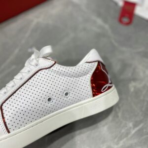 The Fun Vieira low-top sneaker sits on a white rubber sole and stands out for its nude calfskin lined interior. It boasts elegant lines characteristic of Maison Christian Louboutin know-how and combines white calfskin with sport-inspired perforated leather. This minimalist this modern shoe stands out for its iridescent red patent calfskin counter adorned with the designer’s signature.