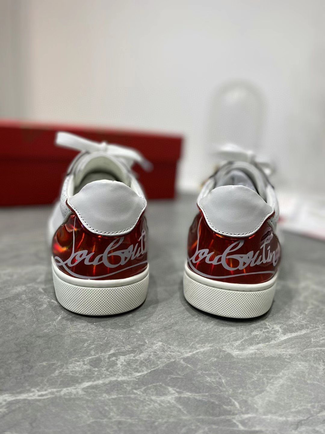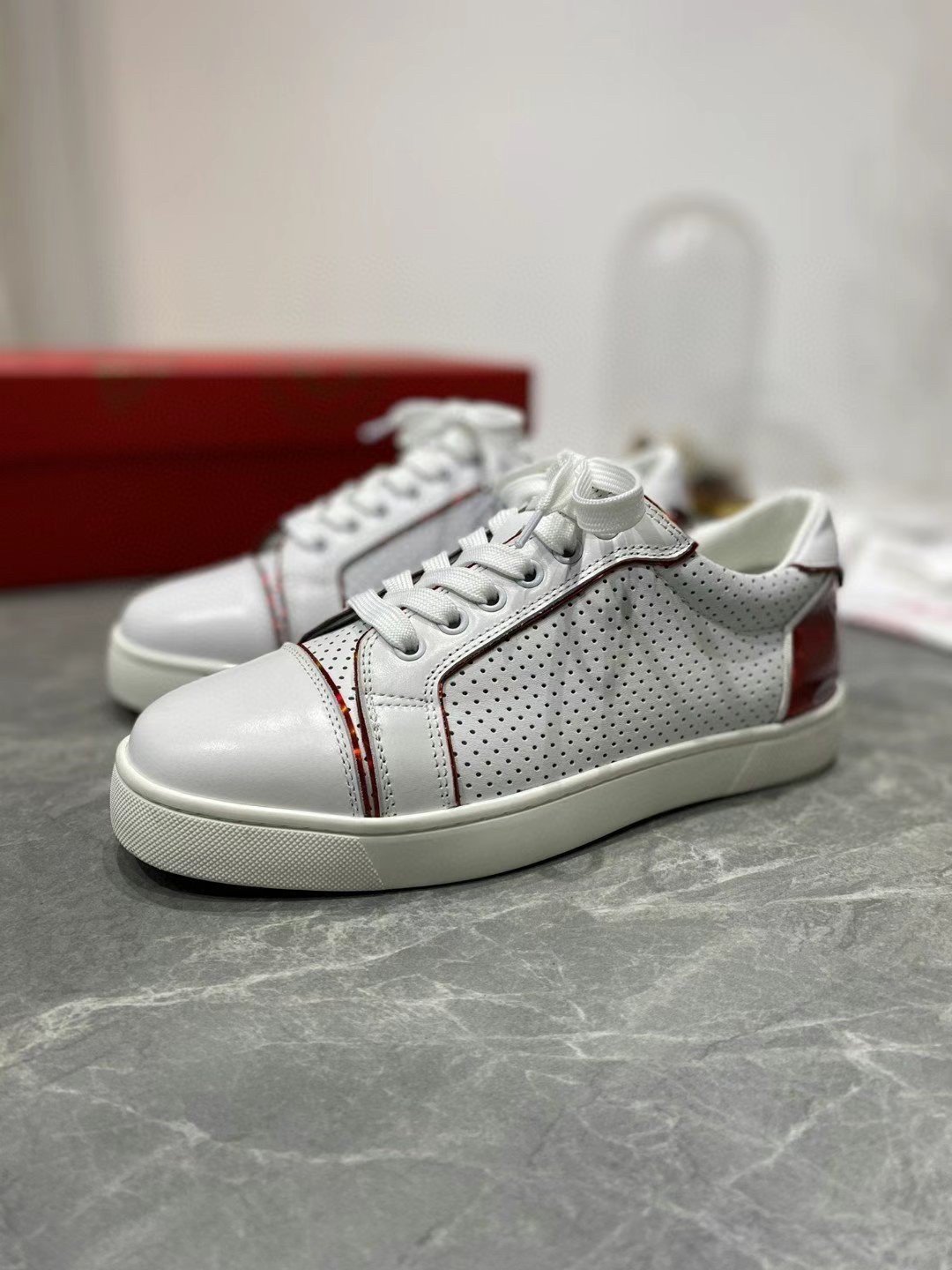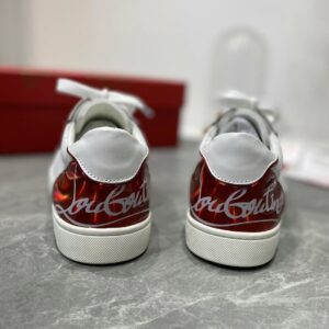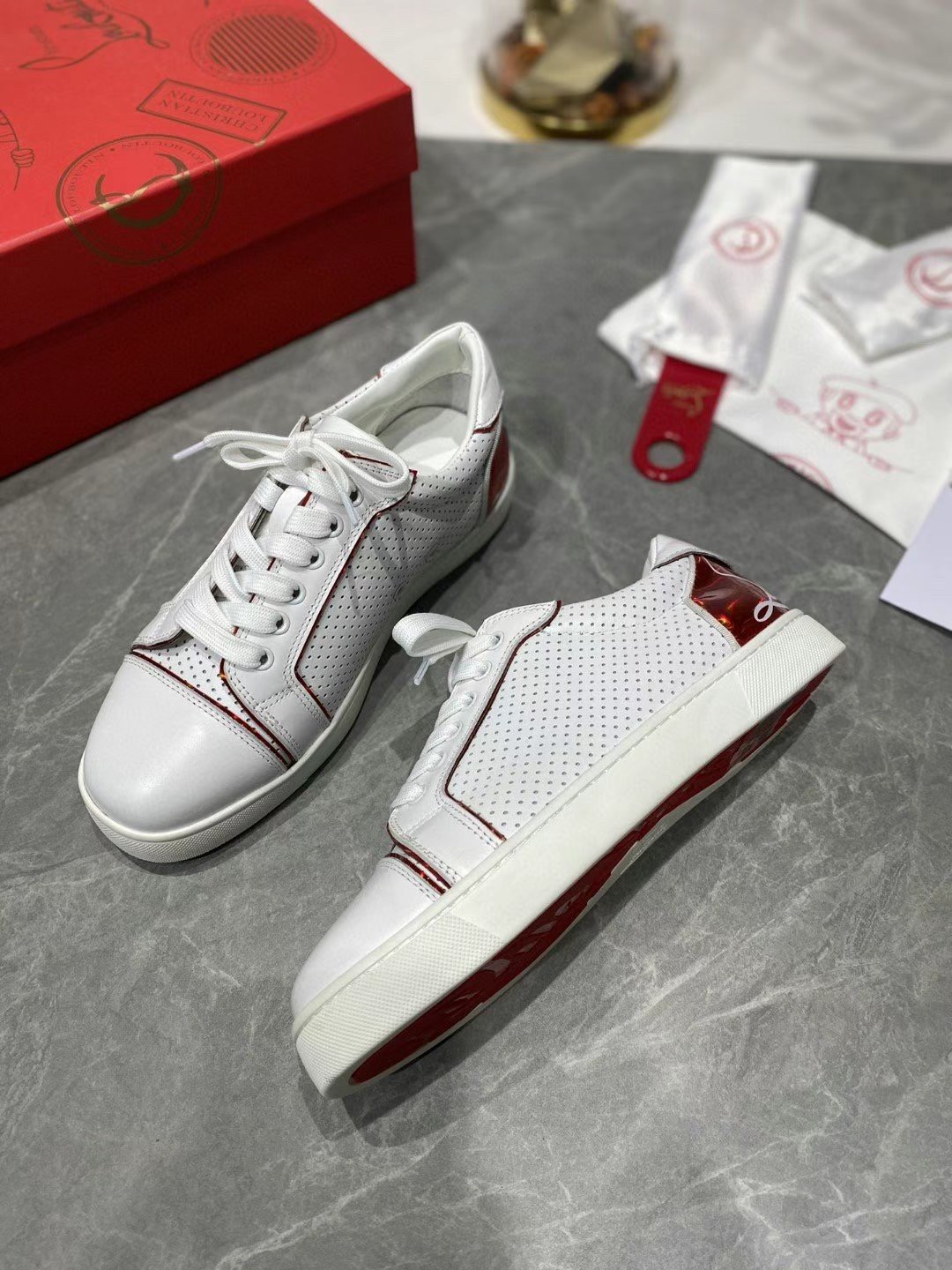 The Fun Vieira low-top sneaker sits on a white rubber sole and stands out for its nude calfskin lined interior. It boasts elegant lines characteristic of Maison Christian Louboutin know-how and combines white calfskin with sport-inspired perforated leather. This minimalist this modern shoe stands out for its iridescent red patent calfskin counter adorned with the designer’s signature.