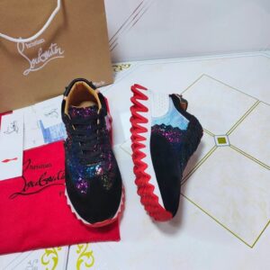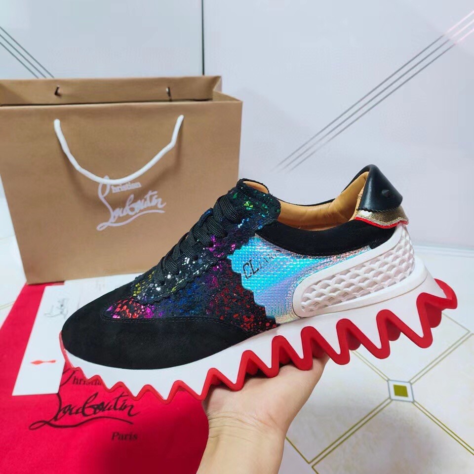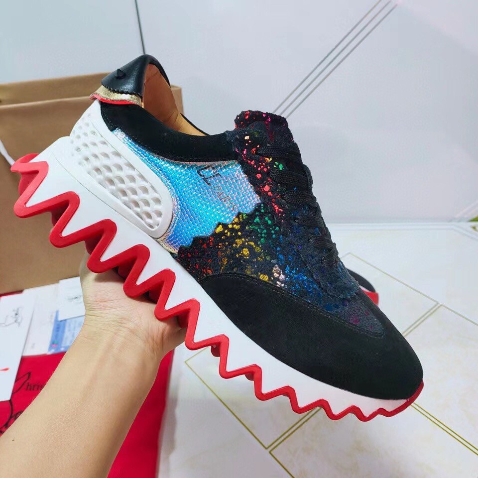 The Loubishark sneaker displays an array of textures and colors. The striking modern design sits atop a dynamic signature sole, where bright red evokes the outline of giant snapping shark teeth. The sneaker is also embellished with shark-teeth edging in red across the vamp, encircling the eyelets and on the heel tab. This model features camo-inspired suede milky way contrasting with SP Arlequin, a geometric design that truly pops.