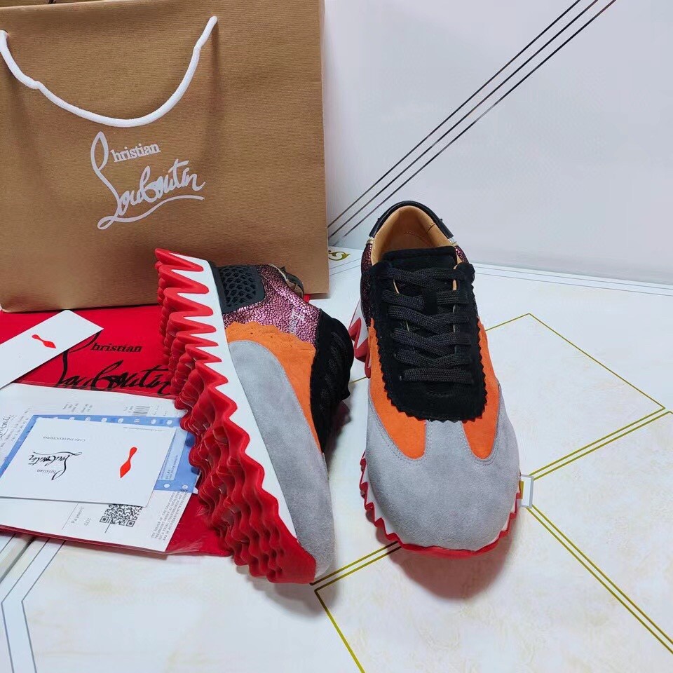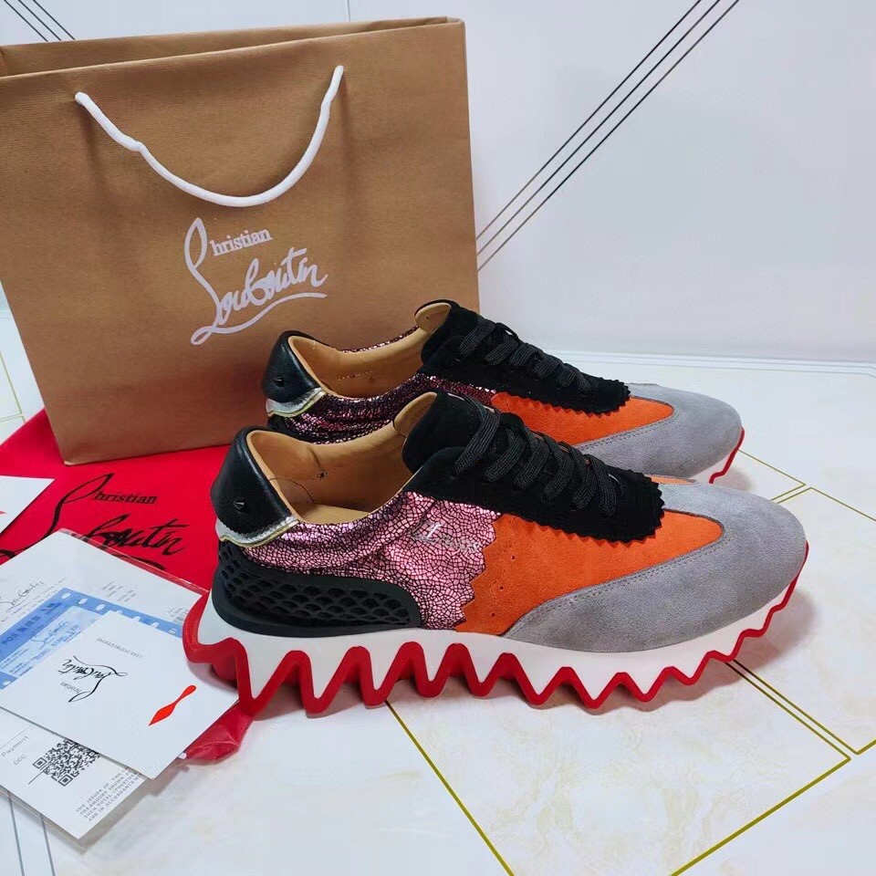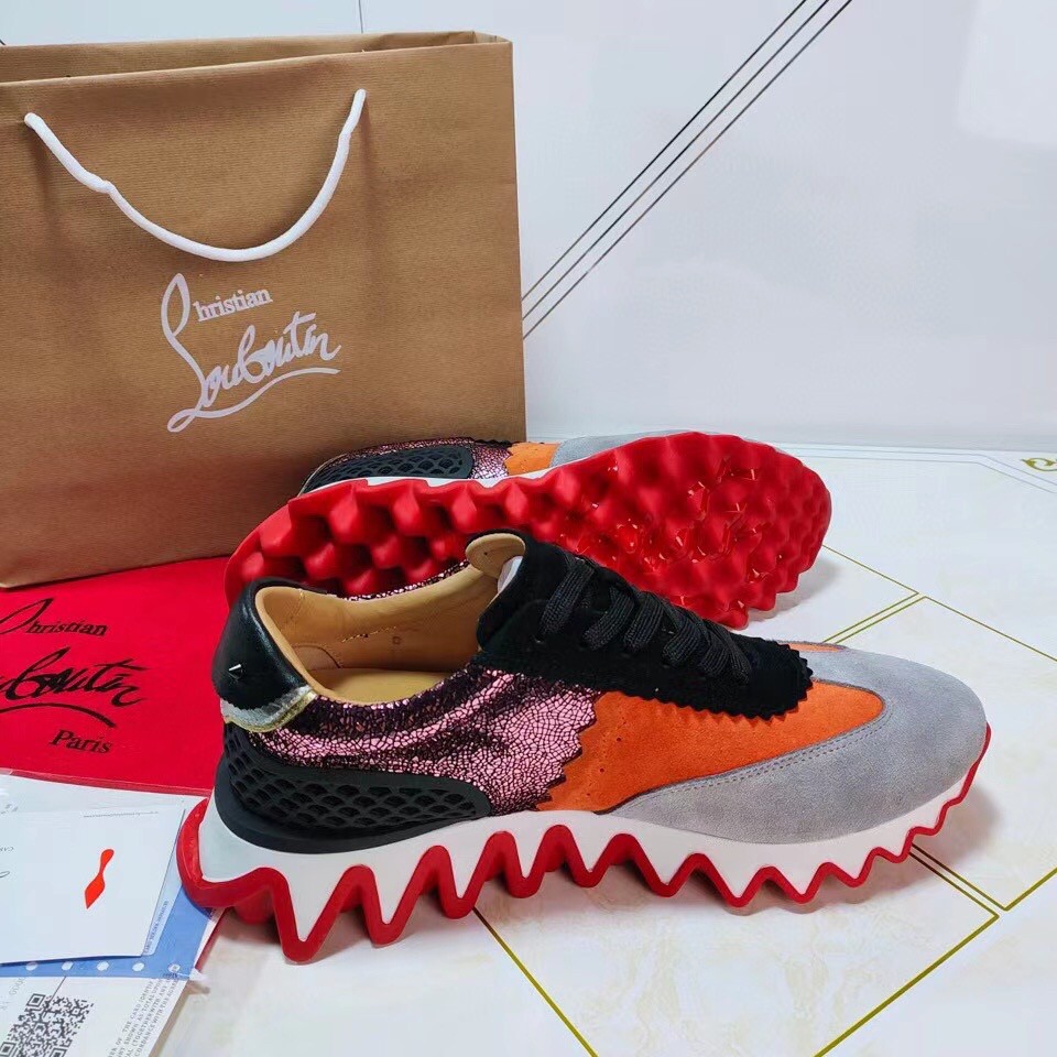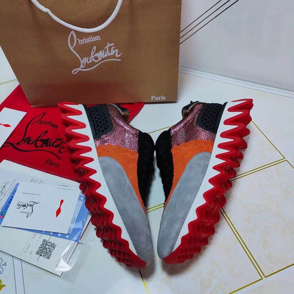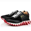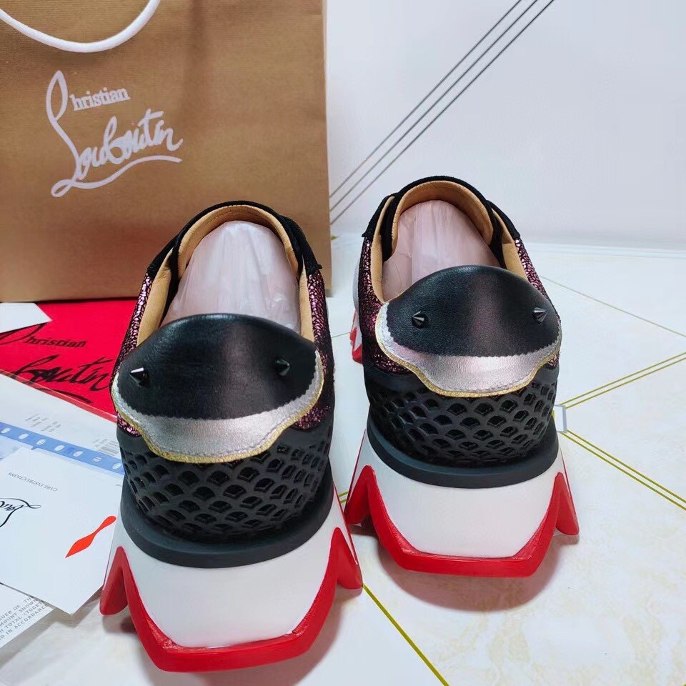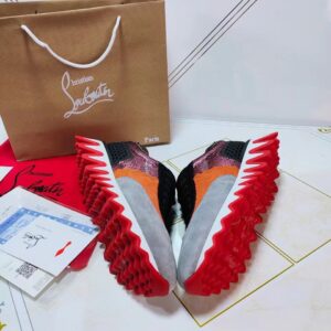 The Loubishark low sneaker comes with a serrated sole and stands out for its architectural design, drawing its inspiration from the world of running. Adorned with geometrically shaped borders, its multicoloured upper combining velvet calfskin, lamé suede and nappa leather is enhanced by an openwork heel cap as well as a nappa leather band decorated with spikes.