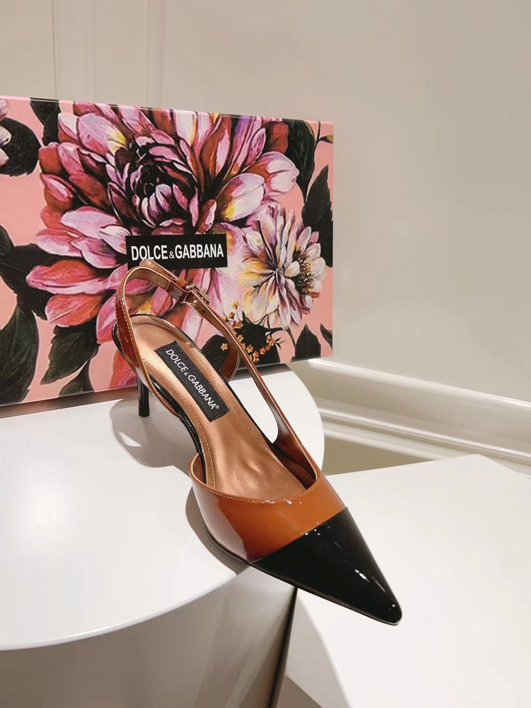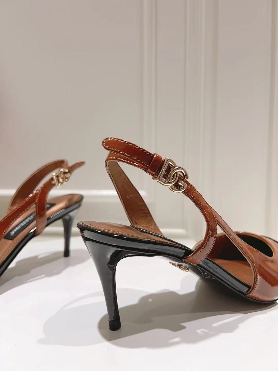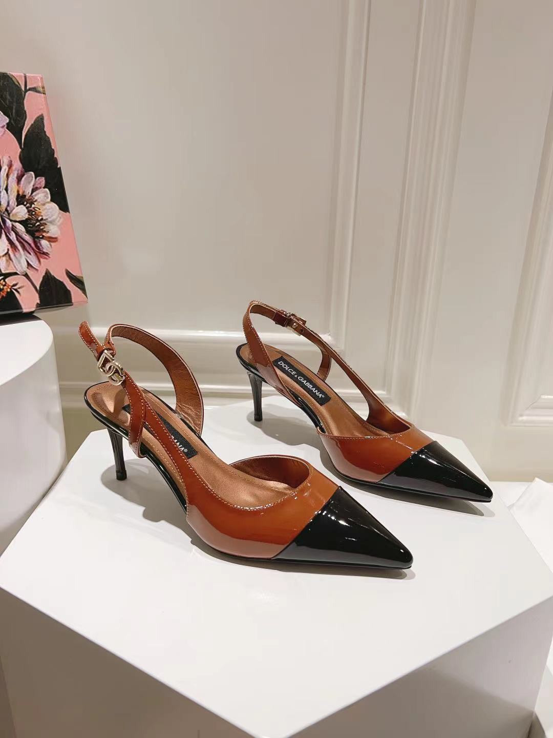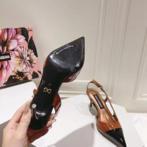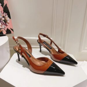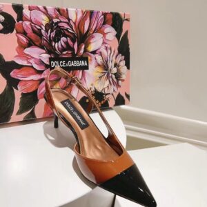 These mid-heel slingback pumps are crafted from glossy patent leather in dual-tones. Accentuate the pointed toe silhouette by styling with cropped hemlines. They feature a bold, tapered shape. Feminine and elegant, they come branded with the DG logo.