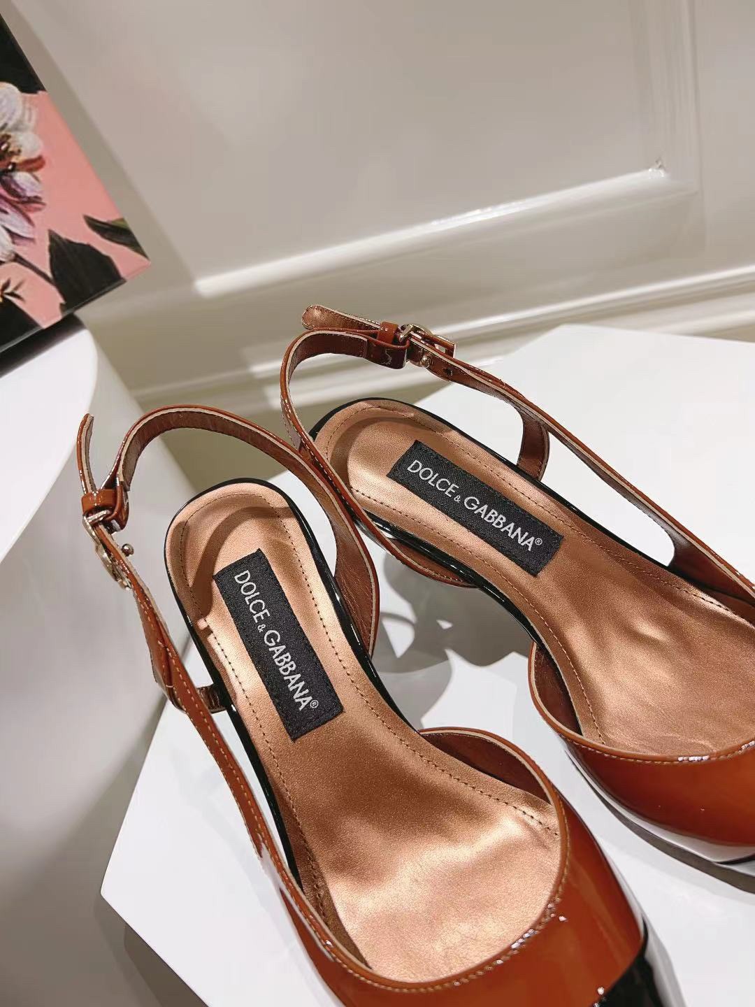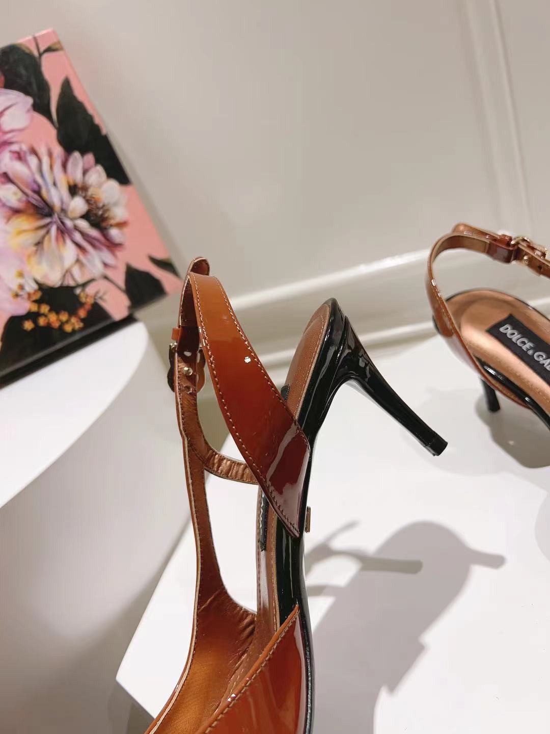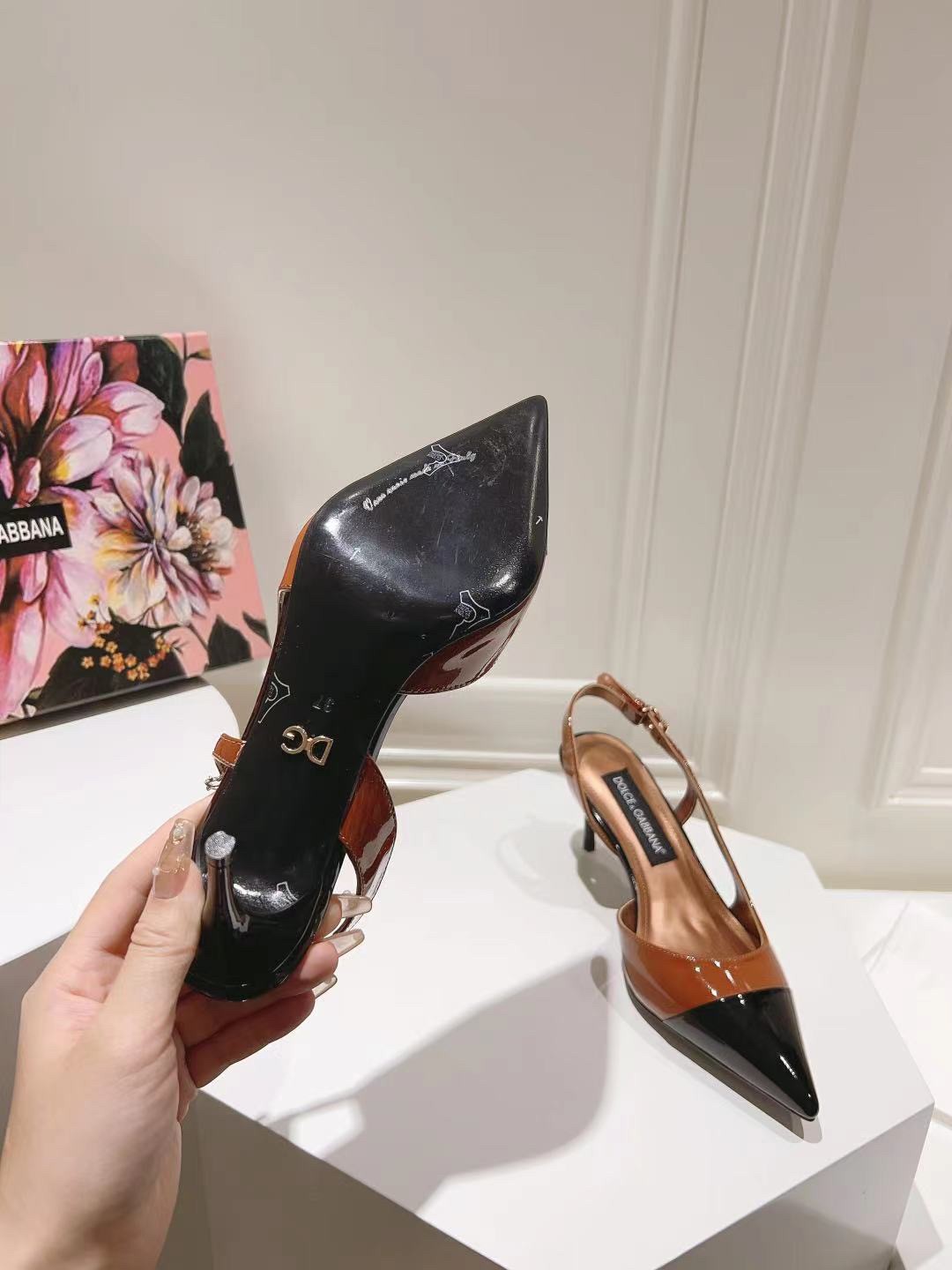 These mid-heel slingback pumps are crafted from glossy patent leather in dual-tones. Accentuate the pointed toe silhouette by styling with cropped hemlines. They feature a bold, tapered shape. Feminine and elegant, they come branded with the DG logo.