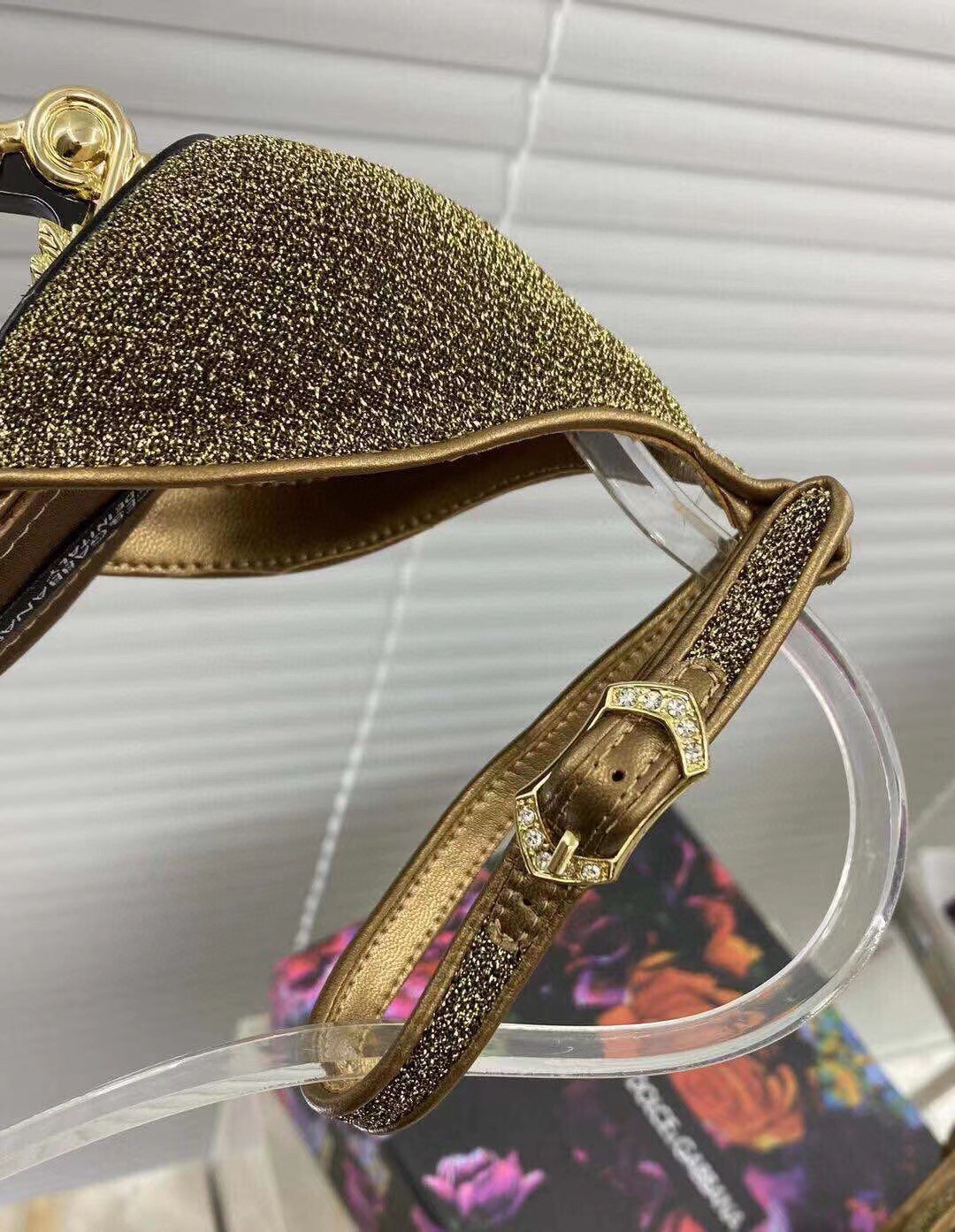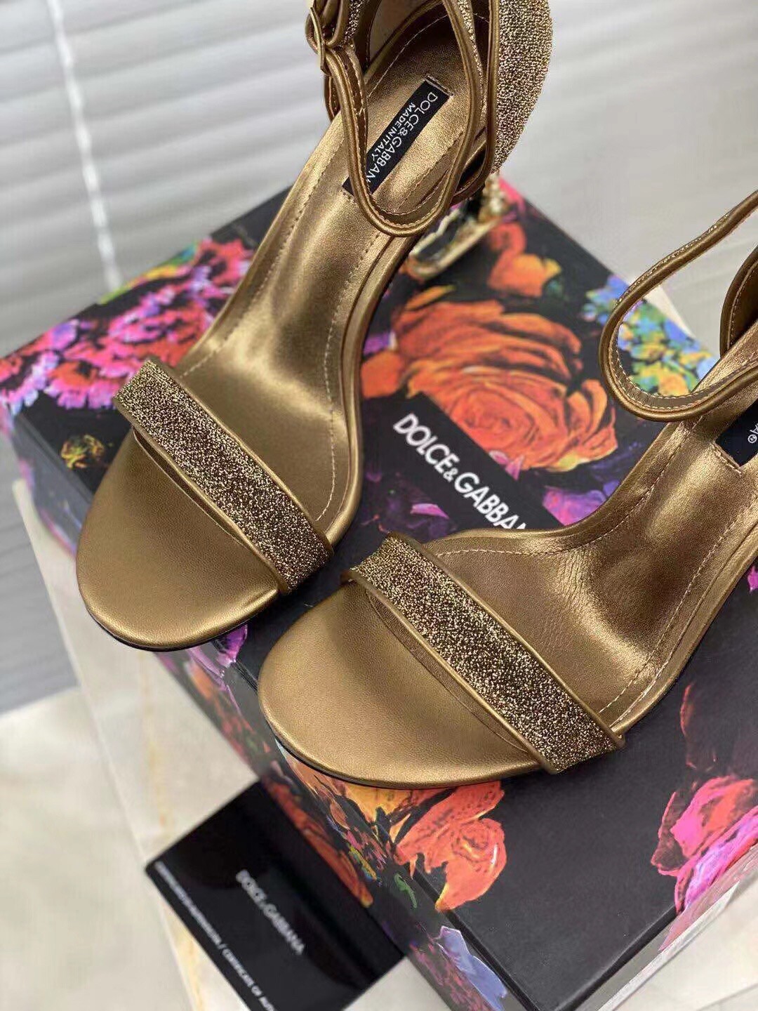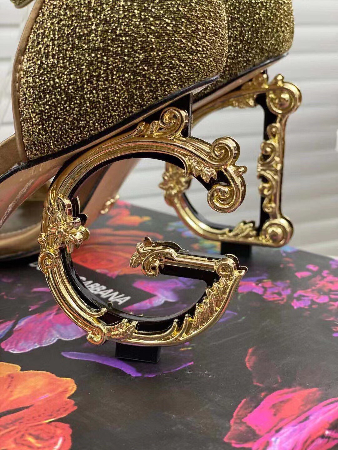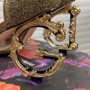 These sandals from Dolce & Gabbana will help you outline a chic look. The gold sandals have been crafted from leather and lurex fabric in a design of open toes, single vamp straps, buckled ankle straps, and heels shaped as the DG logo.