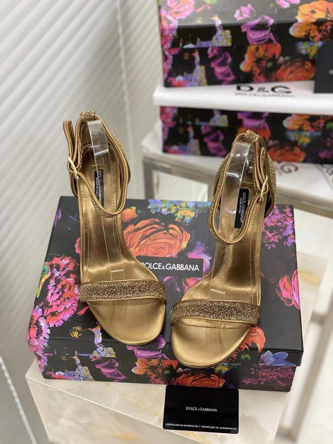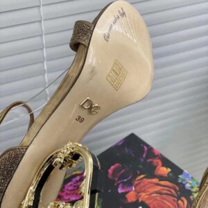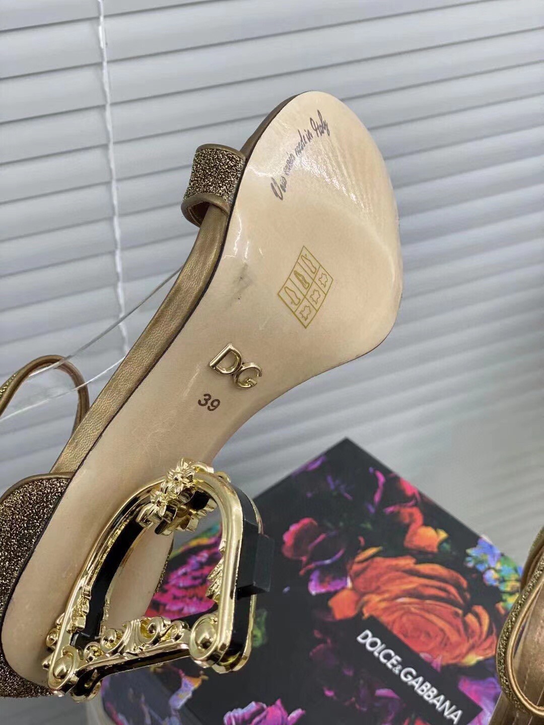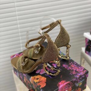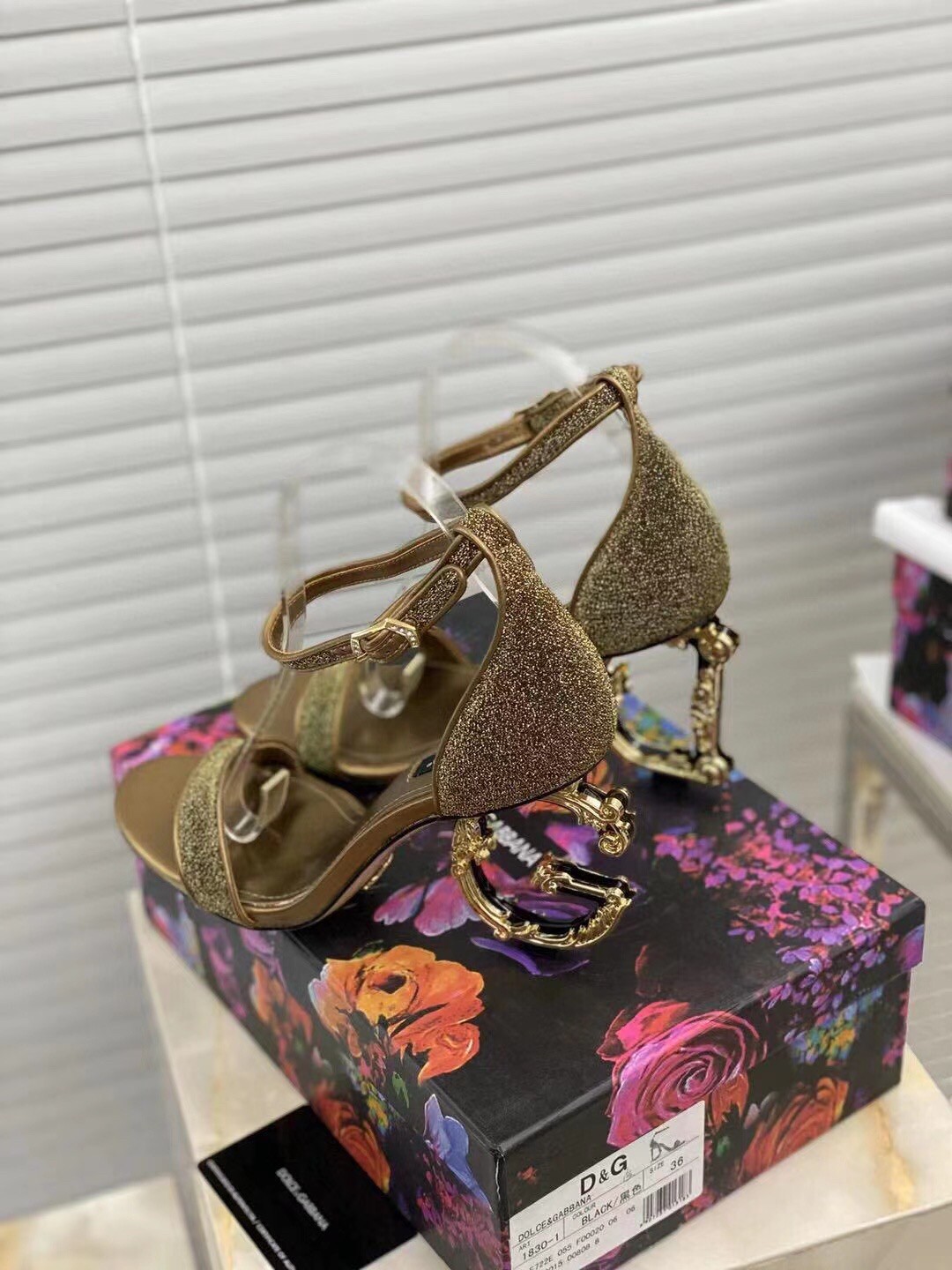 These sandals from Dolce & Gabbana will help you outline a chic look. The gold sandals have been crafted from leather and lurex fabric in a design of open toes, single vamp straps, buckled ankle straps, and heels shaped as the DG logo.
