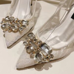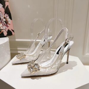 Featuring an iconic, timeless shape, these slingbacks from the Rainbow collection come in white lace. Feminine and elegant, they flaunt the iconic brooch made from colorful crystals that match the upper.
