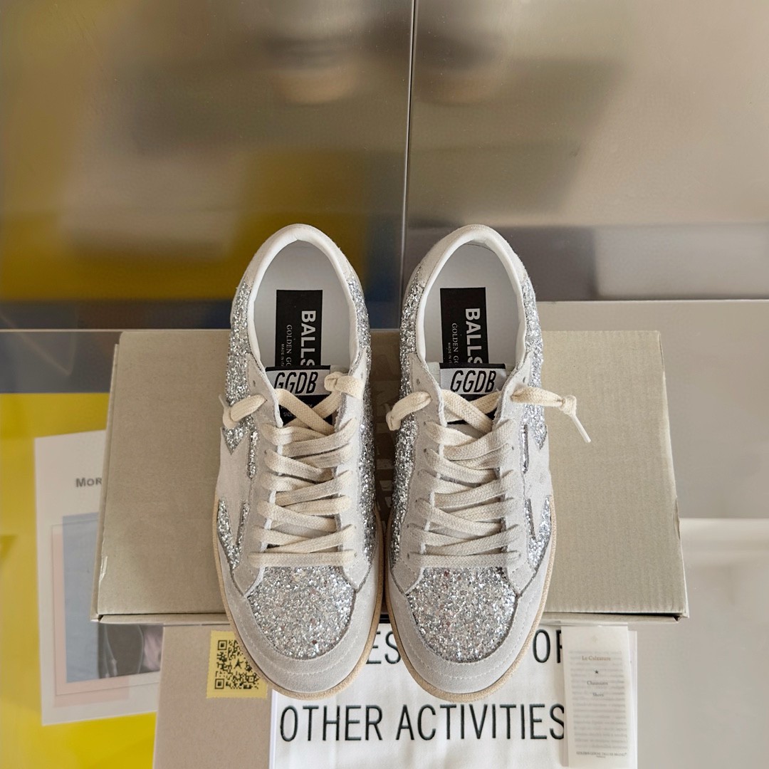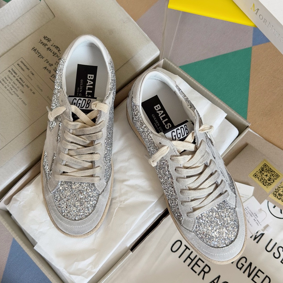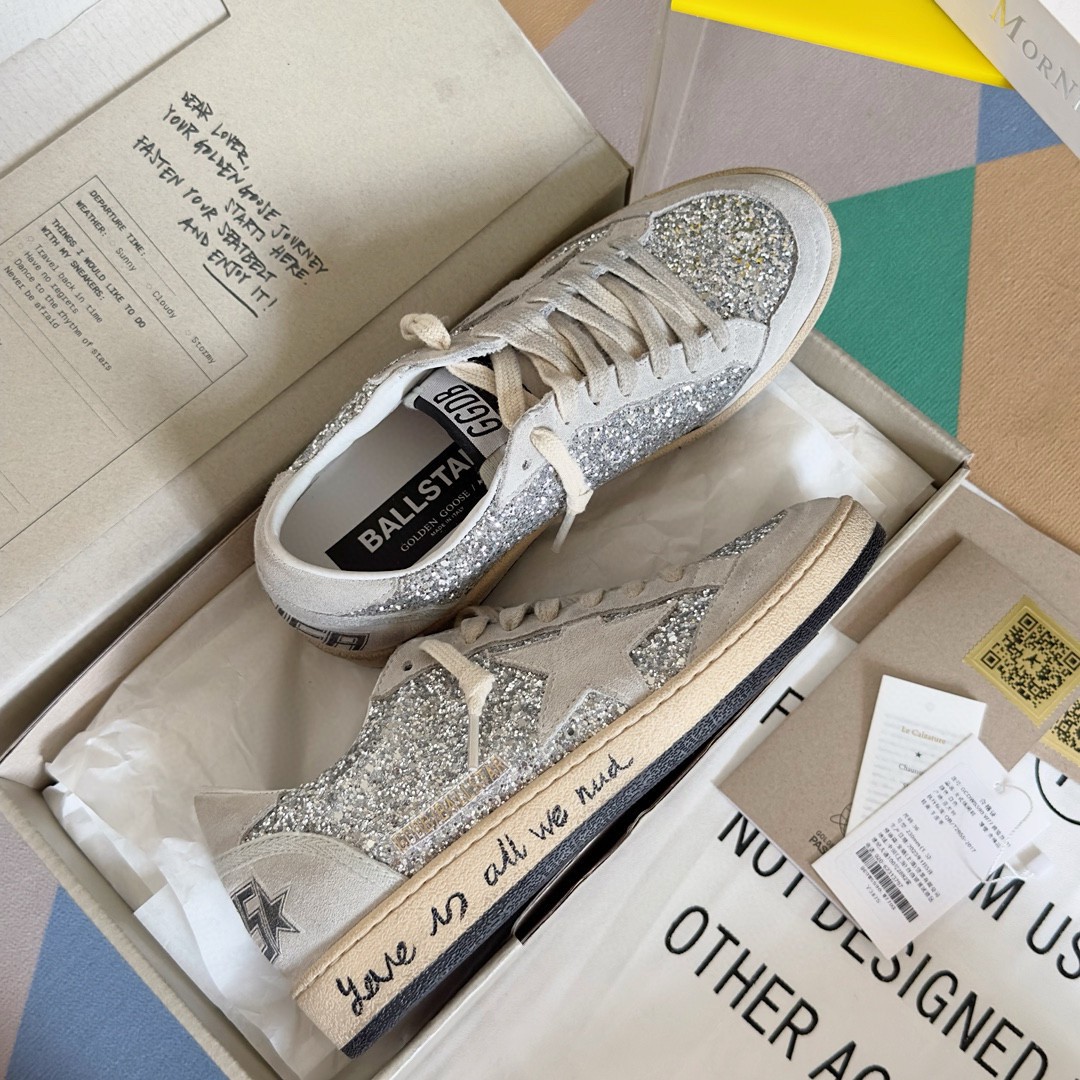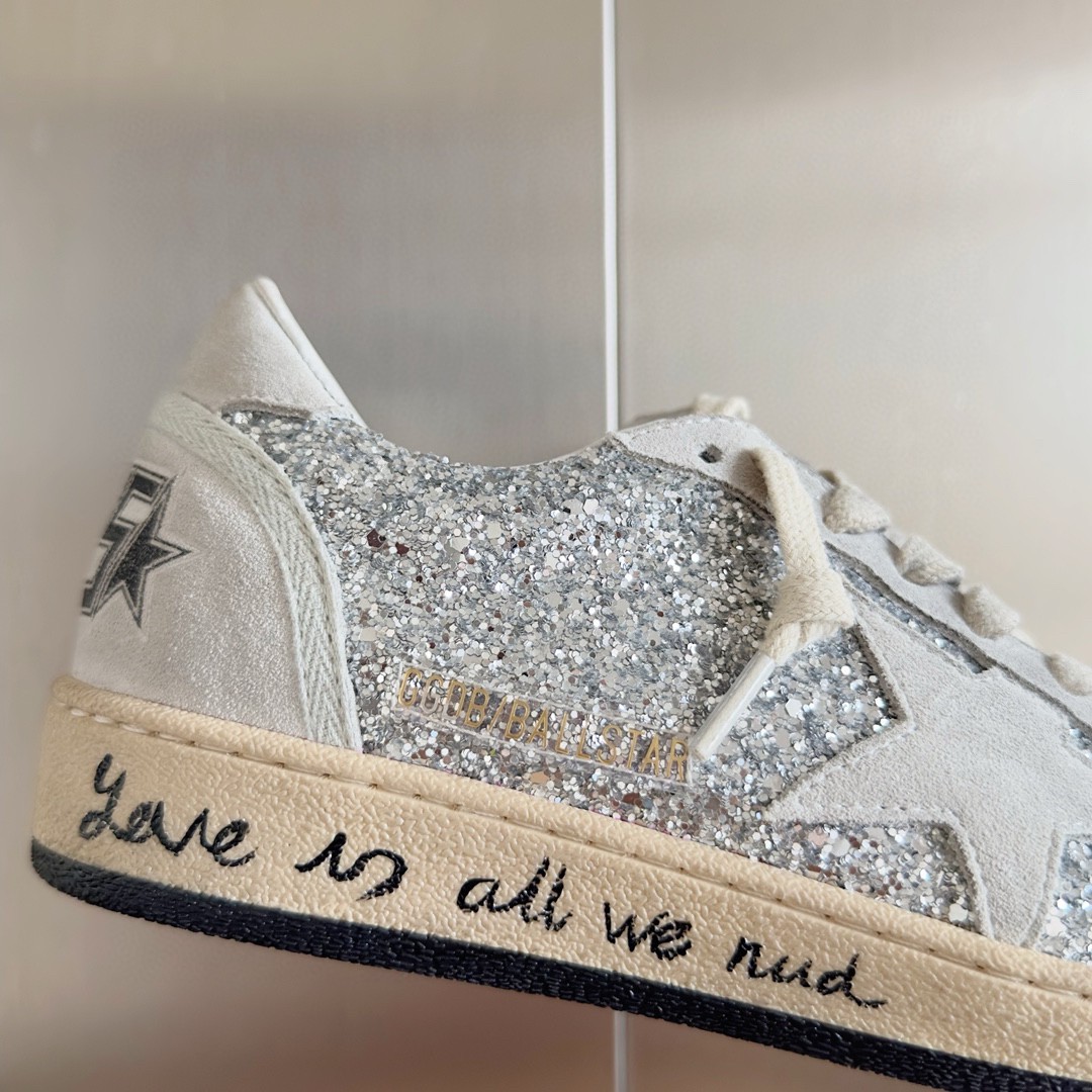 Dreaming of the Eighties. Golden Goose’s Ball Star sneakers have an American college vibe and a feeling of the basketball scene around at the time. With a silver glitter upper, this model features ice-gray suede inserts, including the star and heel tab. The contrasting Love Is All We Need lettering on the foxing, black sole and cream-colored laces add the finishing touch: beautiful things that never go out of fashion.