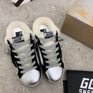 Golden Goose’s iconic sneakers in the new sabot version: lined with soft shearling, these Super-Star sneakers feature a silver laminated leather upper embellished with a black suede star and inserts. The beige shearling tongue and ice-gray laces complete the look.