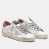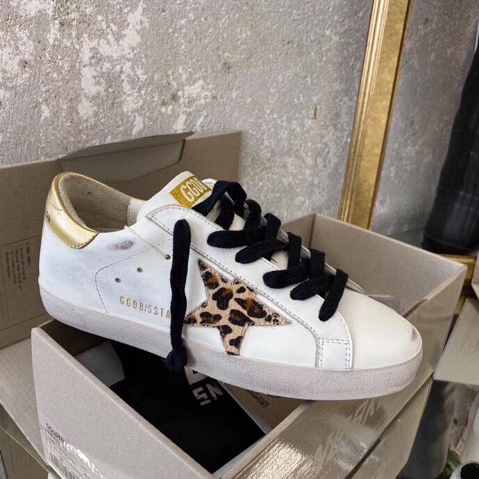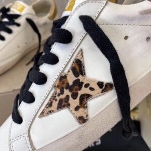 Superstar Sneakers Golden Goose. These white leather sneakers close with black laces. A pony leopard star is sewn on the side and each shoe has a gold back. The insole is 3cm semi-compensated and has a deliberately aged appearance.