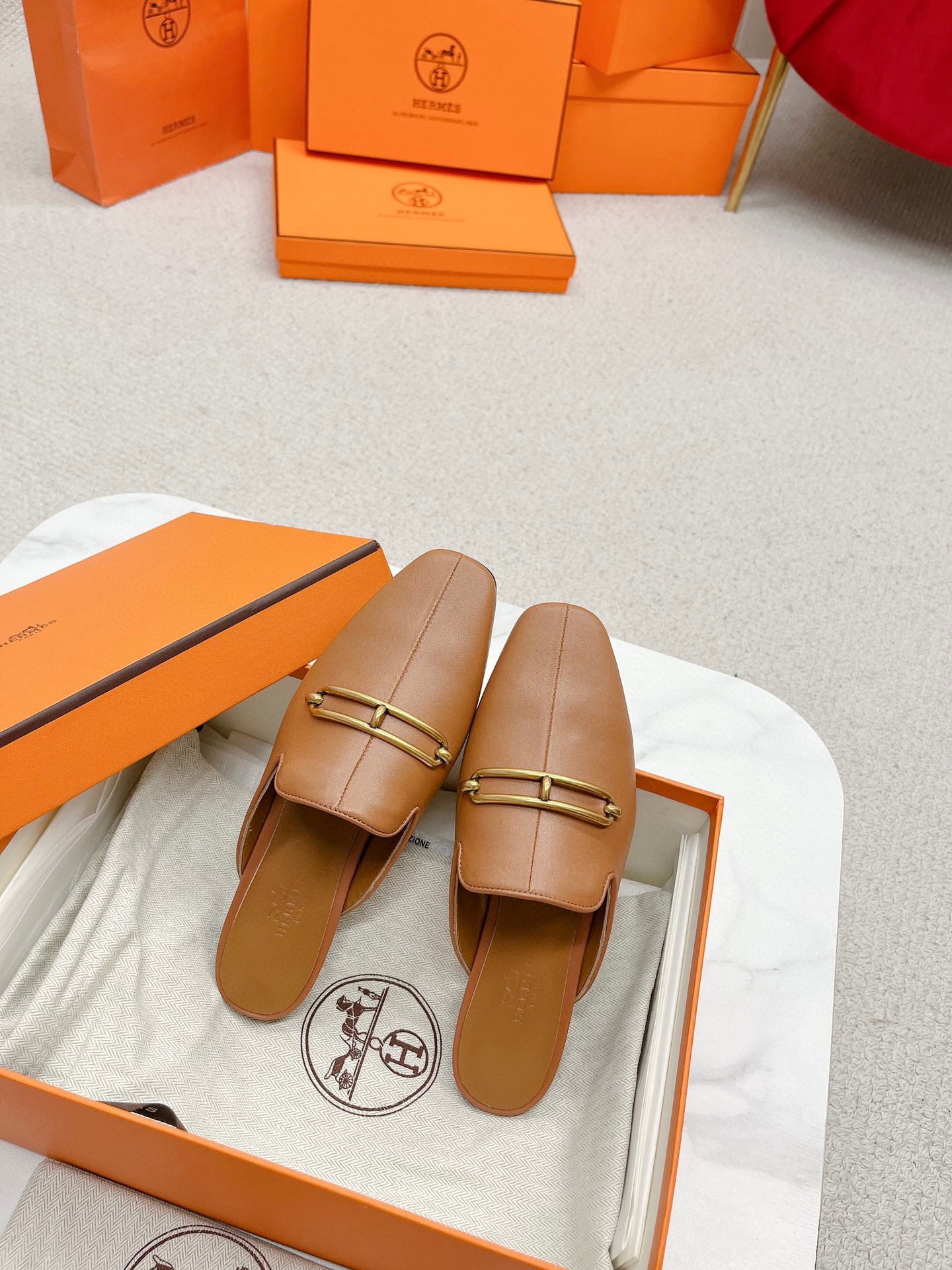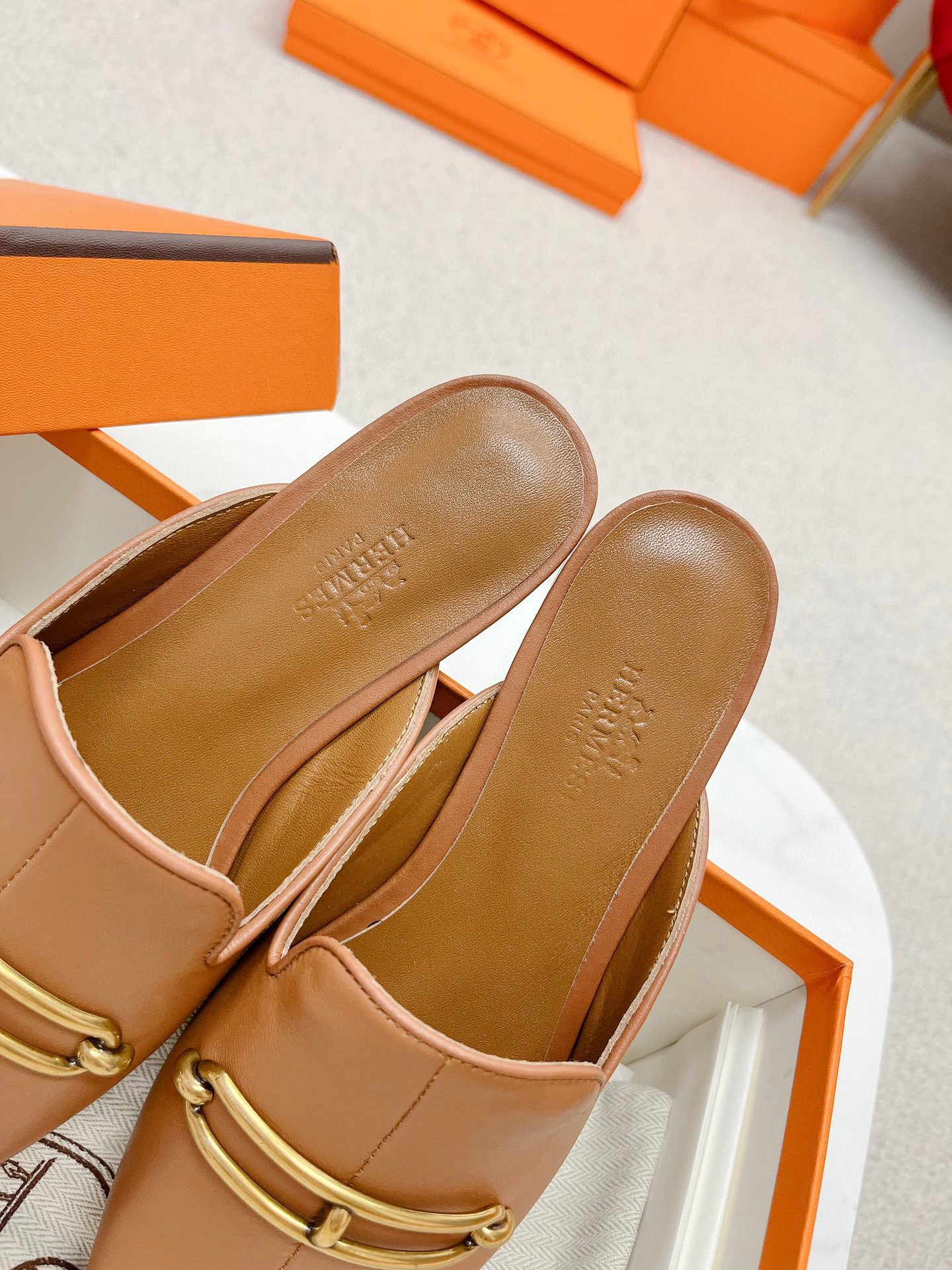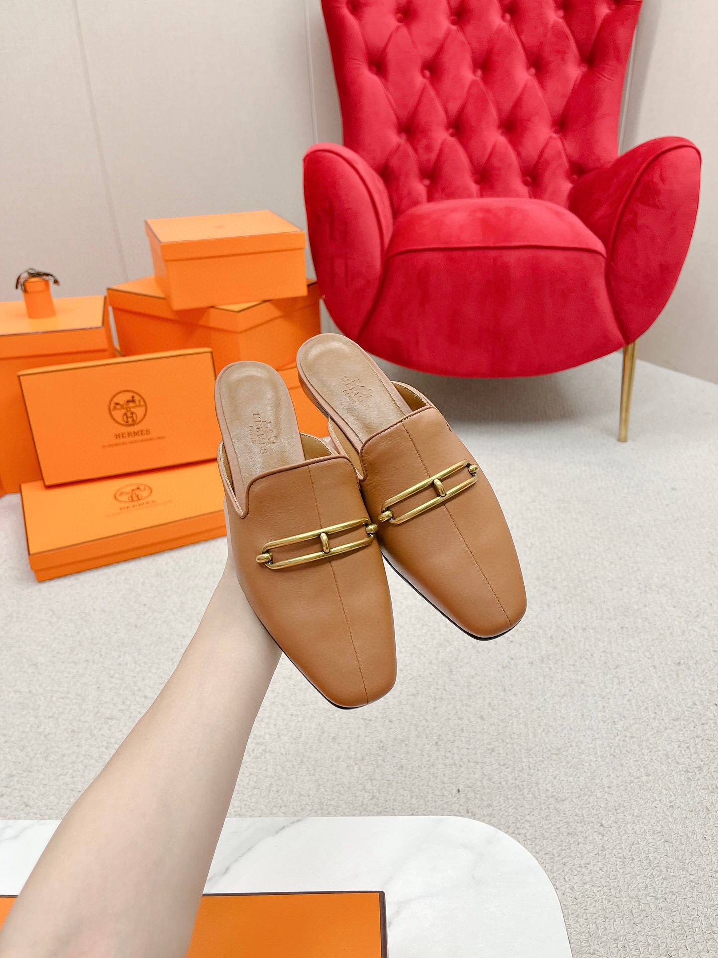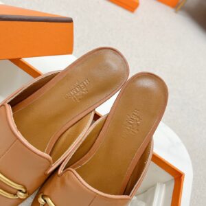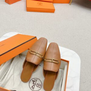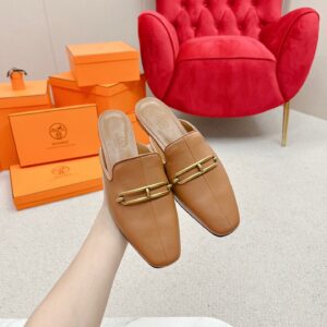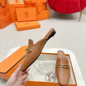 Hermes’s slippers have been crafted from smooth calfskin leather and topped with gold-plated Roulis hardware etched with house’s moniker. They have round toes and a slight heel for added lift. Wear them with with cropped tailoring.