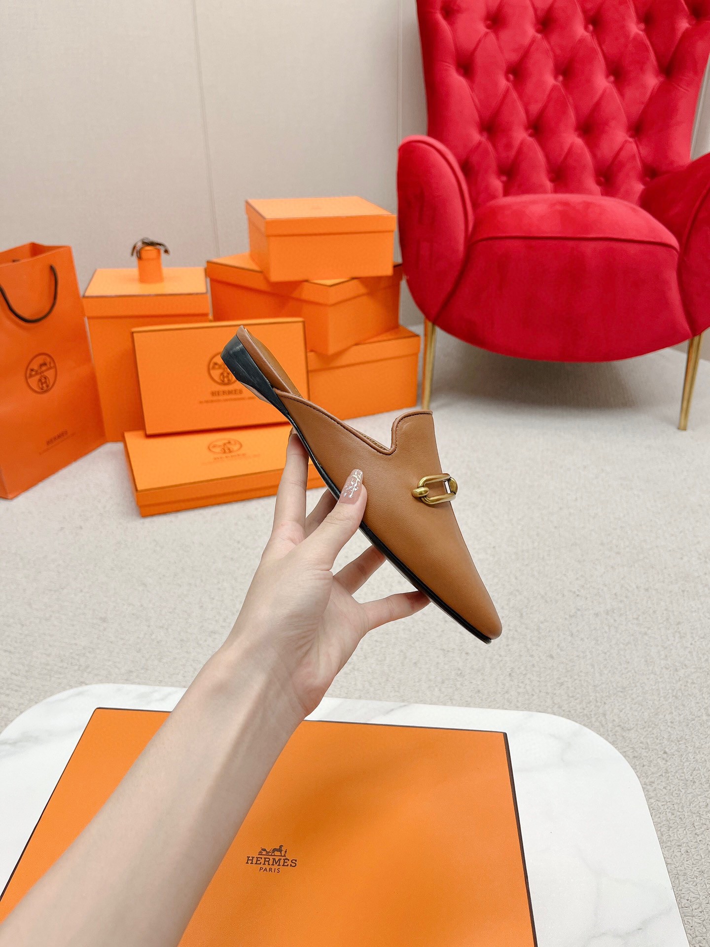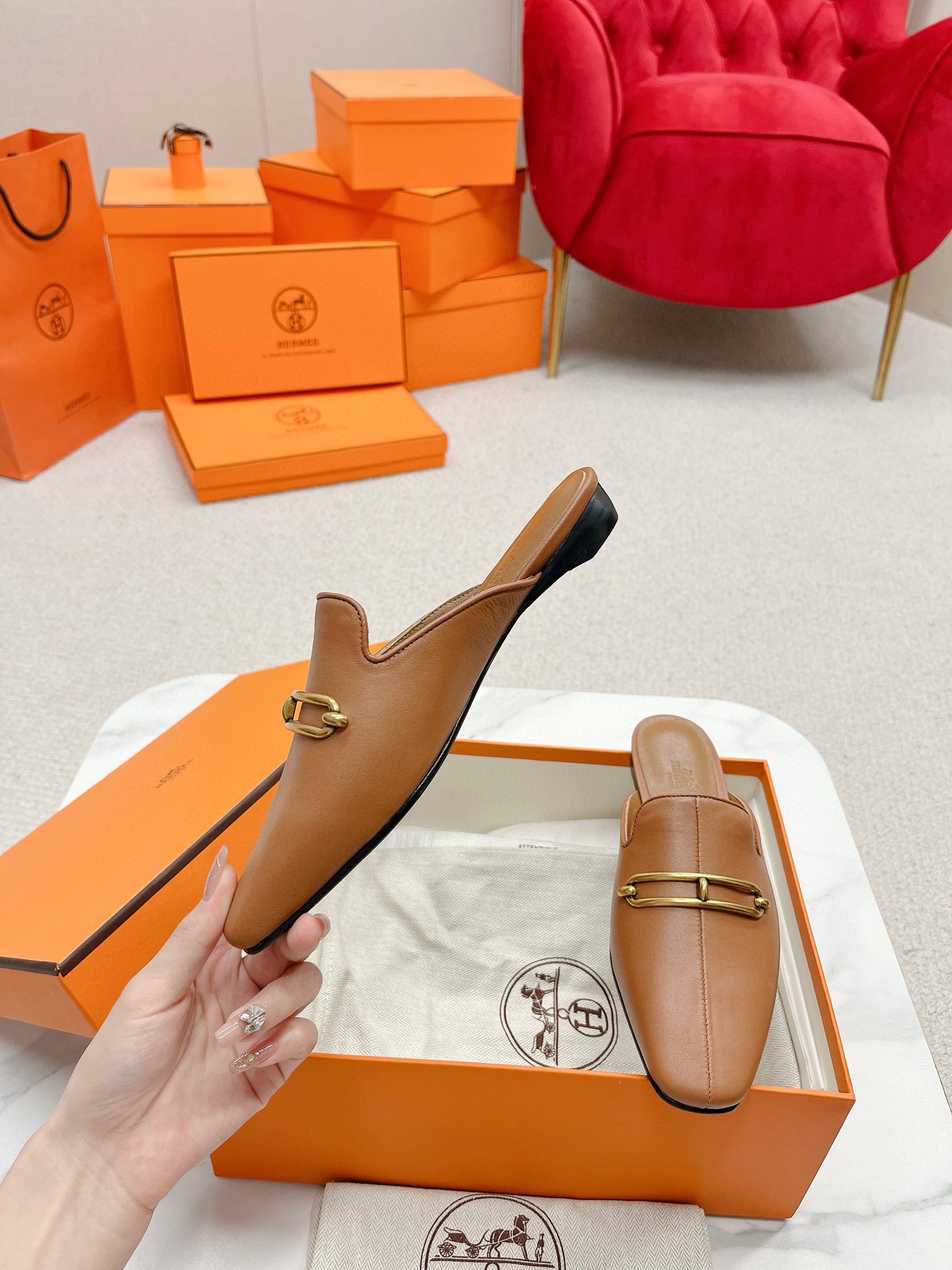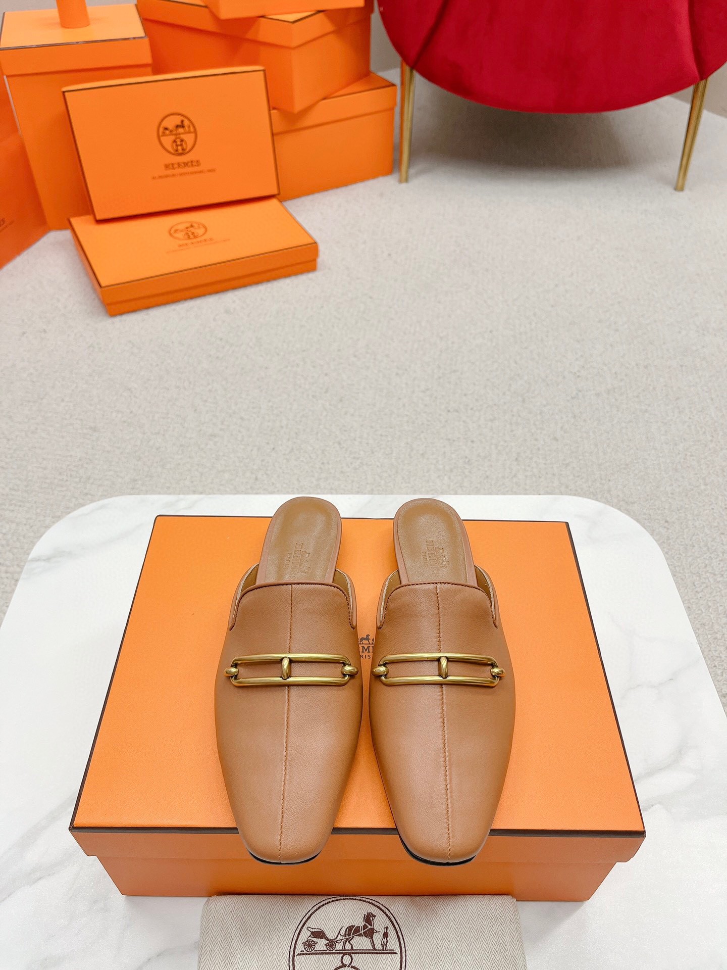Hermes’s slippers have been crafted from smooth calfskin leather and topped with gold-plated Roulis hardware etched with house’s moniker. They have round toes and a slight heel for added lift. Wear them with with cropped tailoring.