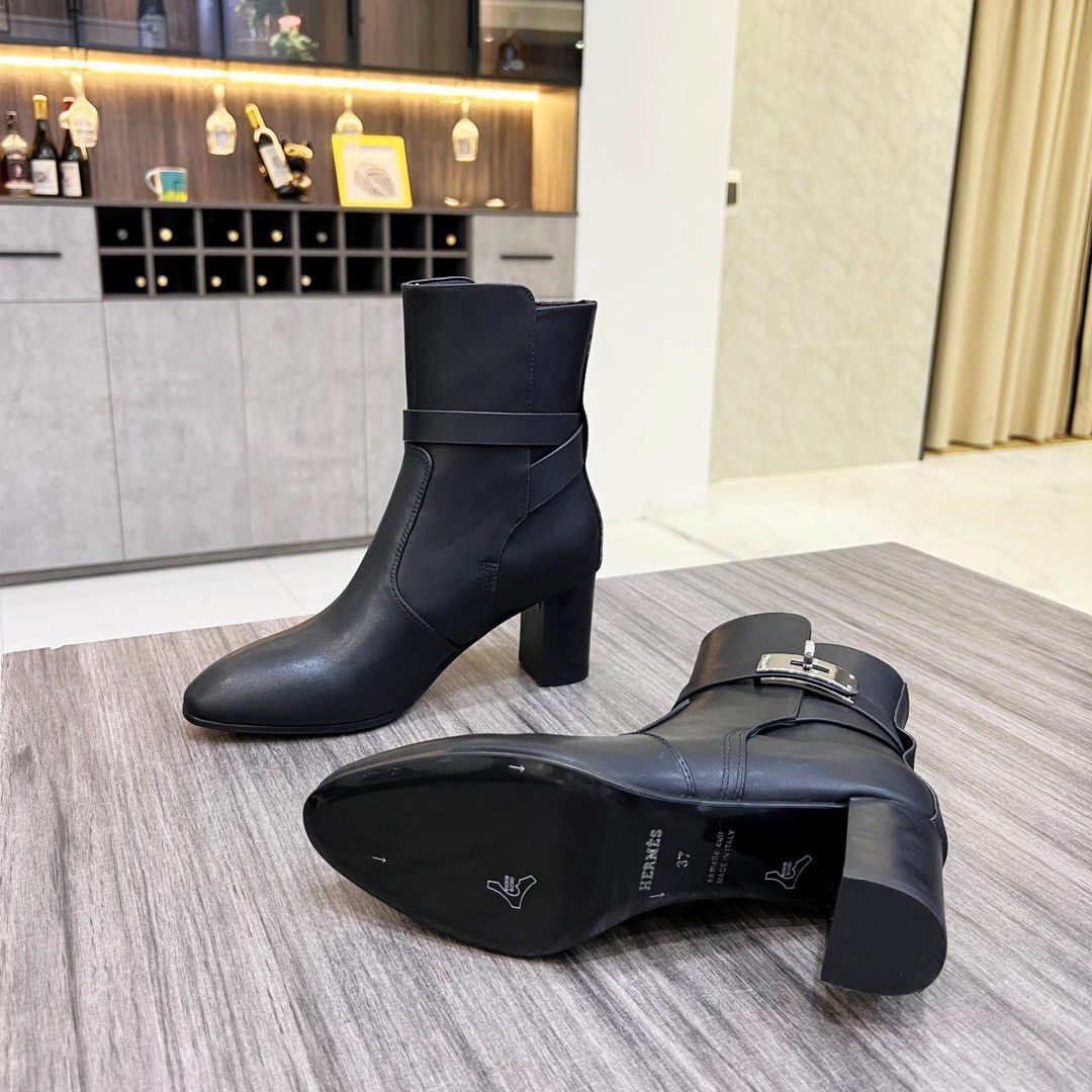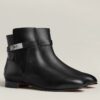 Hermes Frenchie 50 ankle boots are made from calfskin leather in a timeless and versatile black hue. They’re set on 50mm stacked heels and have a signature, palladium-plated Kelly buckle embellishment at the wraparound straps. We love them with skirts and dresses.