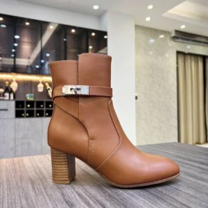 Hermes Frenchie 50 ankle boots are made from calfskin leather in a timeless and versatile brown hue. They’re set on 50mm stacked heels and have a signature, palladium-plated Kelly buckle embellishment at the wraparound straps. We love them with skirts and dresses.