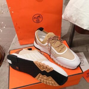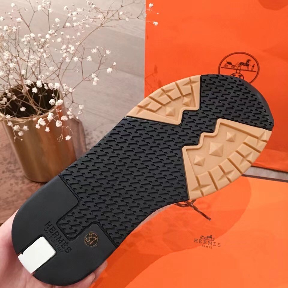 A reinterpretation of a classic style, The Hermes Addict Sneaker in bicolor knit with optical illusion, these pairs feature yellow zigzag rubber insert on the front and black rubber insert on the back, white rubber midsole and white goatskin insole and lining.